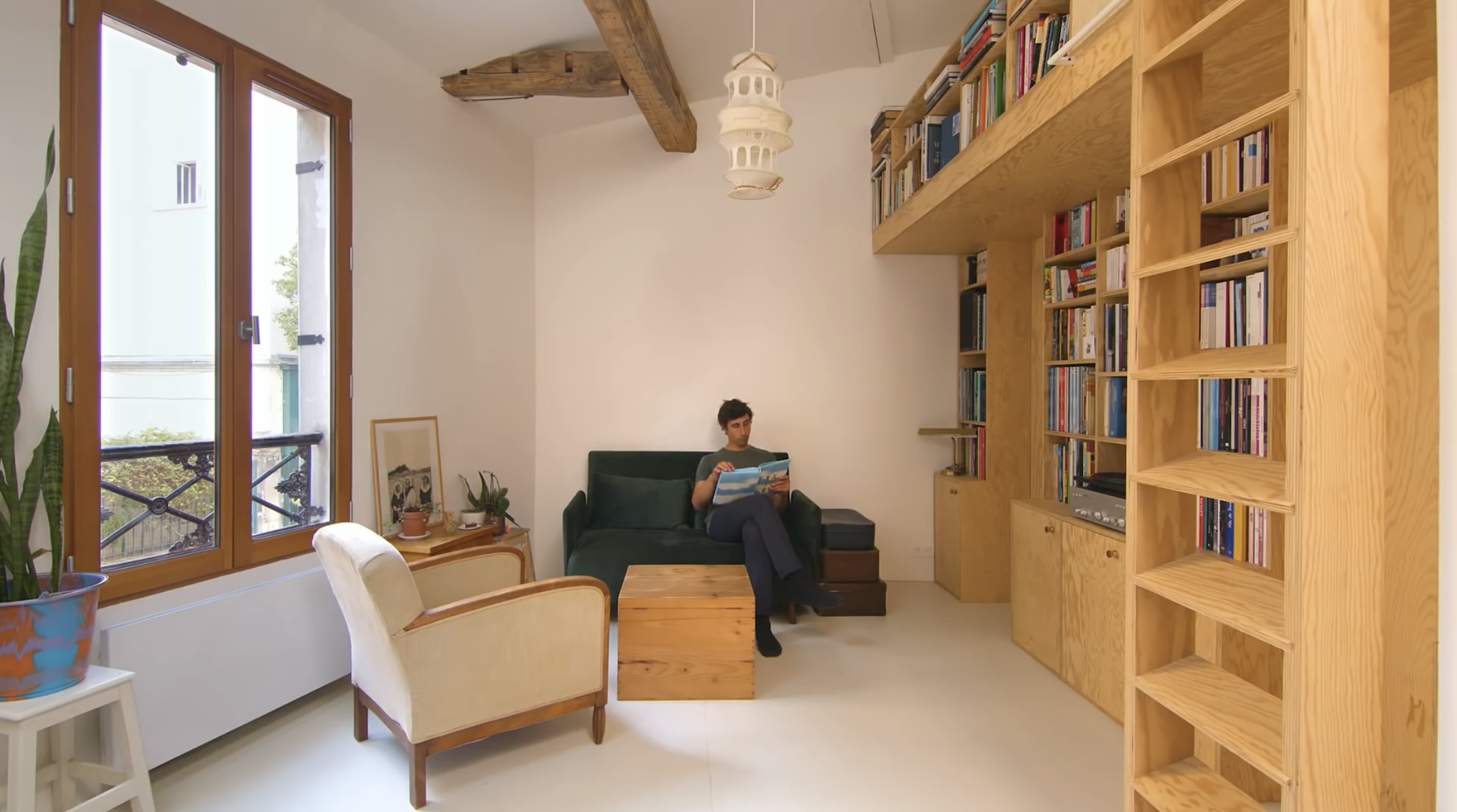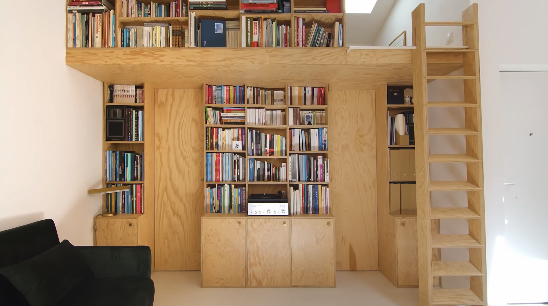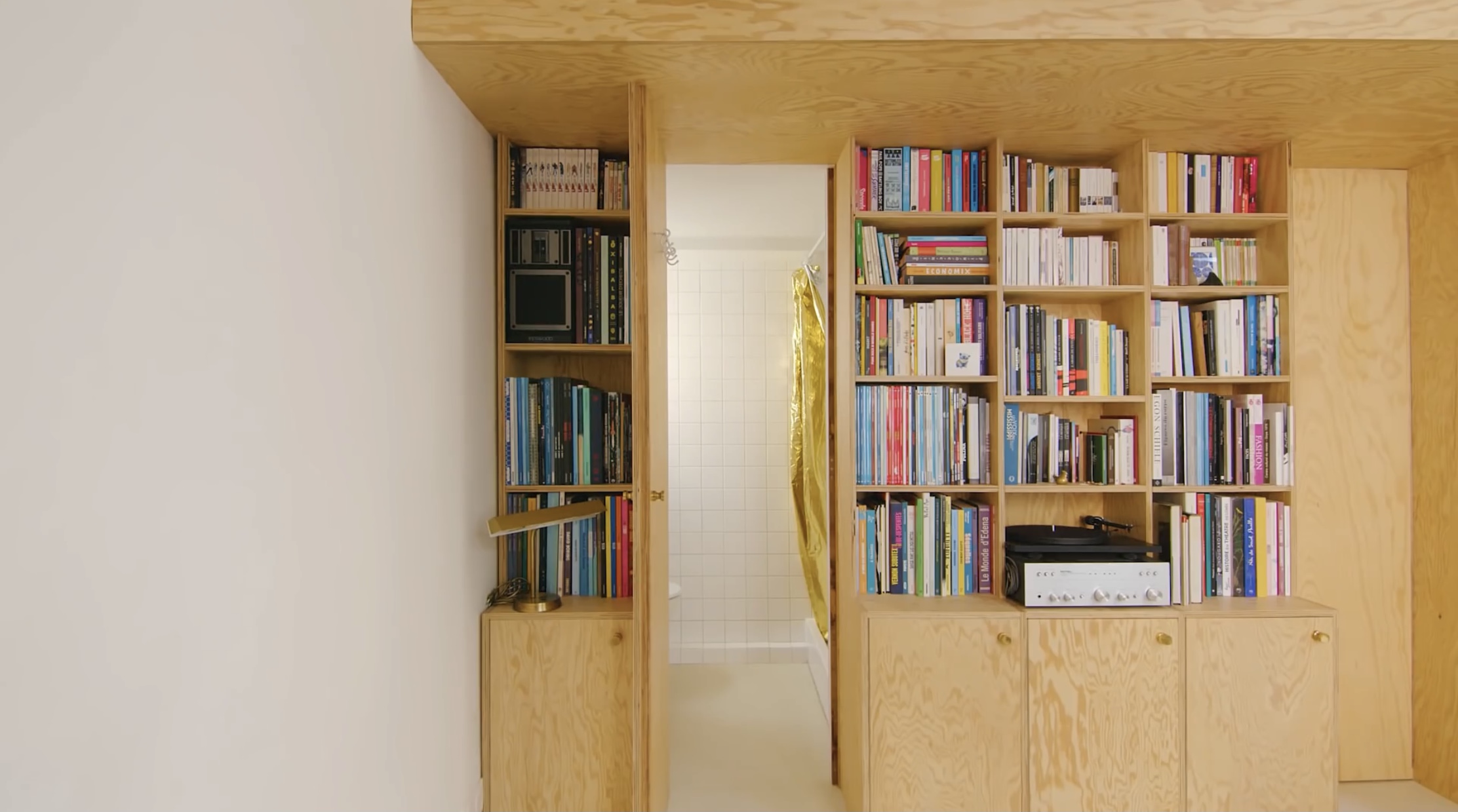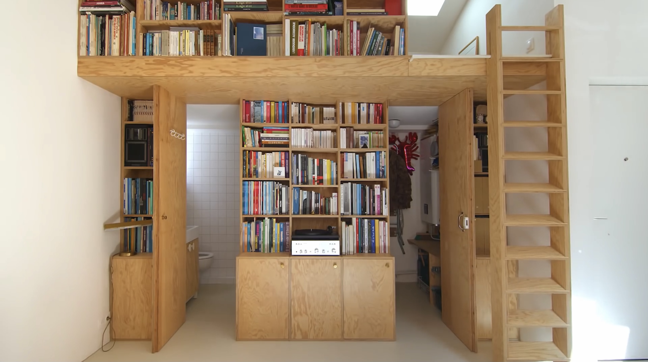 한쪽 공간이 책과 수납공간으로 채워져 있습니다.
