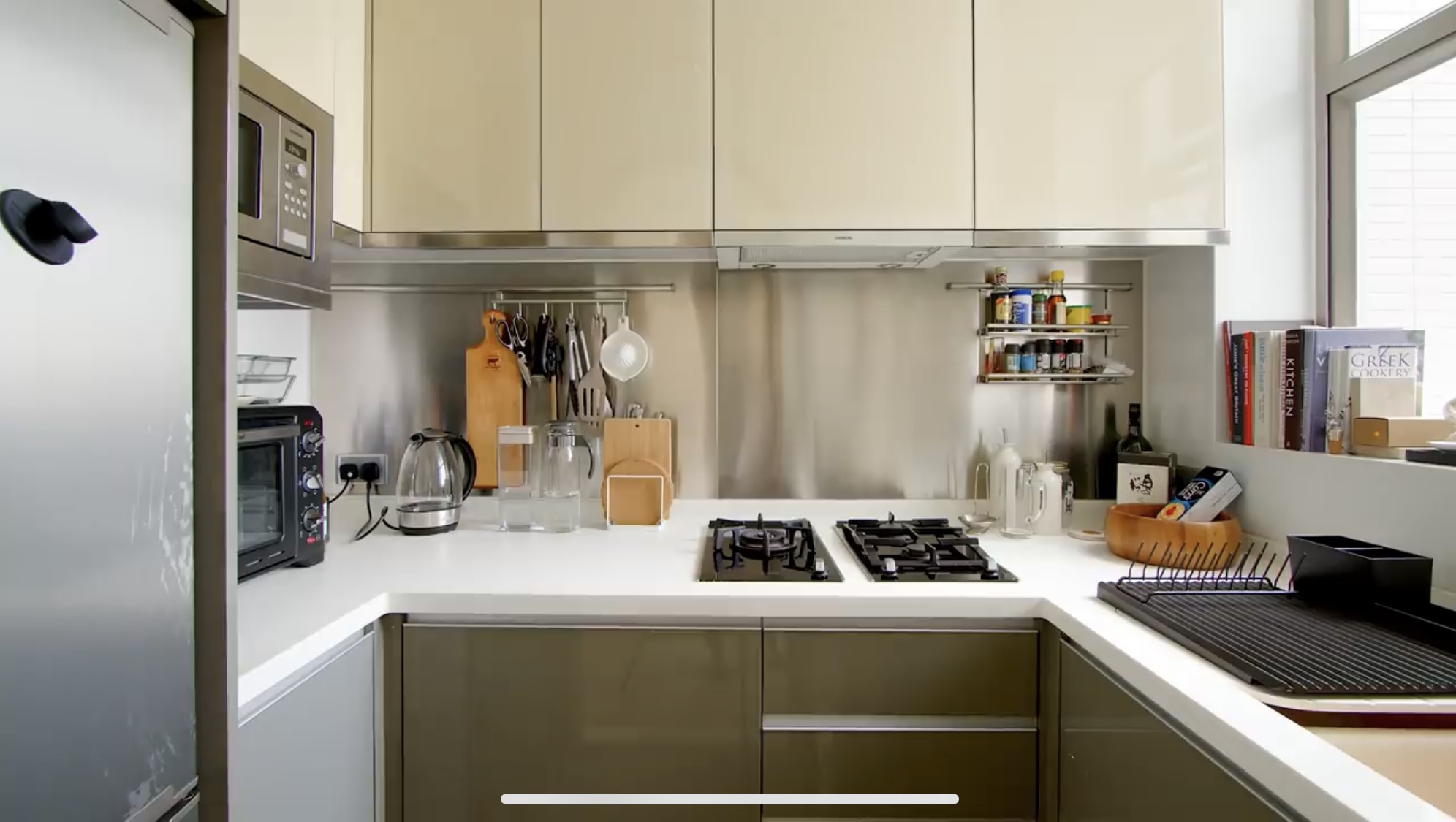 부엌은 베이지, 화이트와 스테인리스, 블랙으로 인테리어 되었습니다.