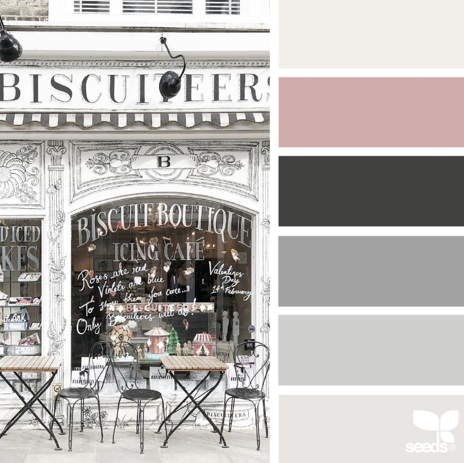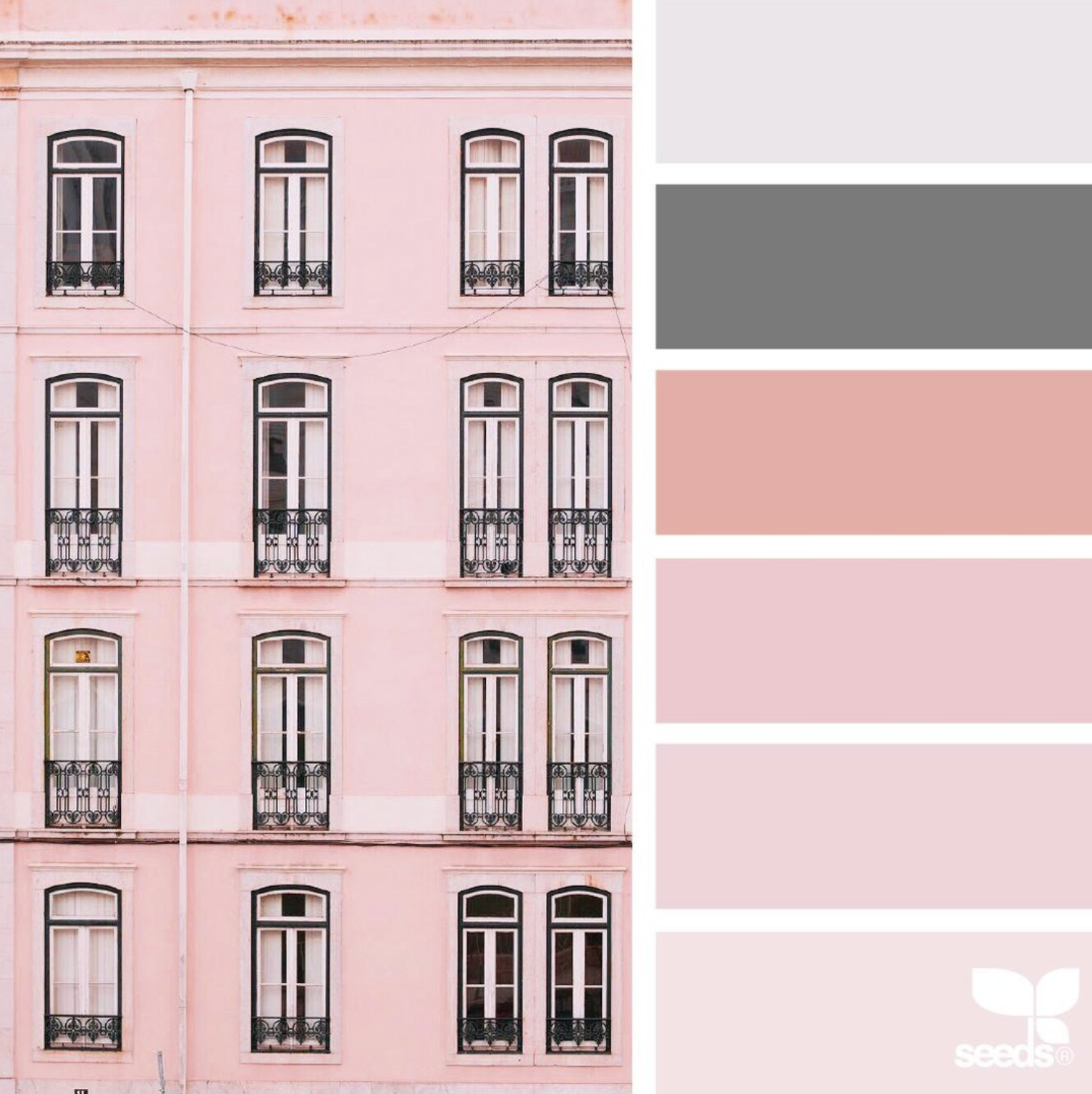 회색과 회색 그라데이션에 포인트로 톤 다운된 분홍색이 가미된 팔레트입니다.