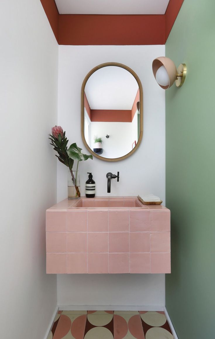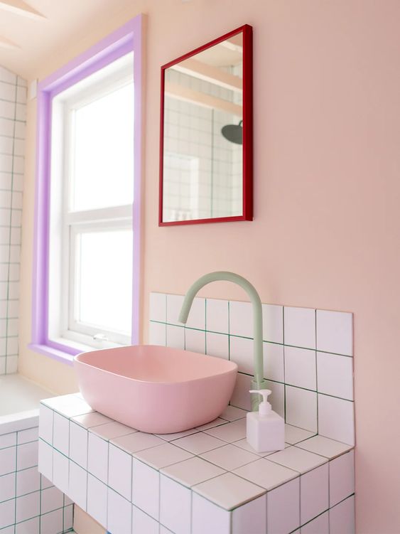 핑크색 세면대와 수전은 연두색, 빨간색 테두리 거울