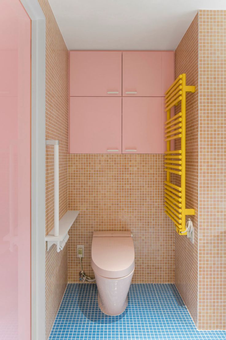 노란색 볼륨감 있는 테두리 + 연핑크색 타일 + 연보라색 세면대의 조화