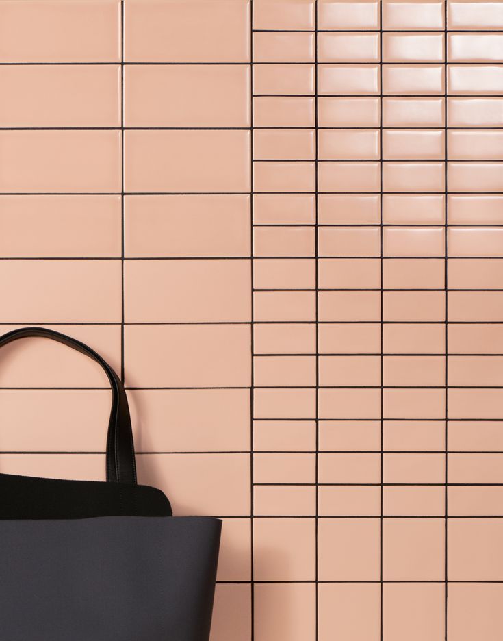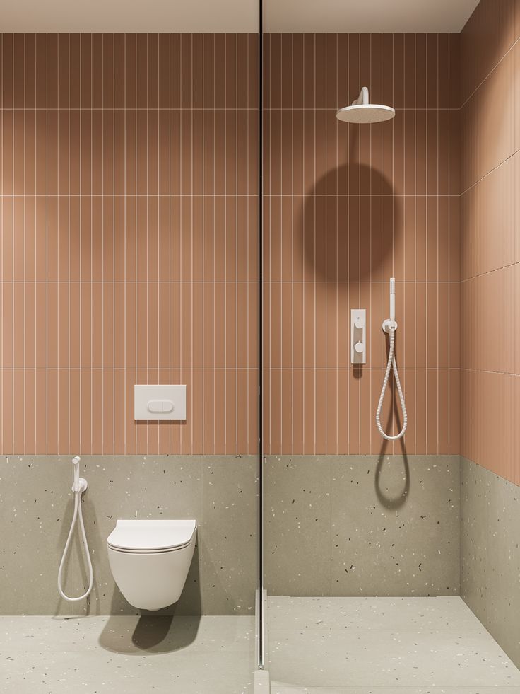 브라운 컬러 세로형 긴 타일과 하단에는 회색 테라조 타일