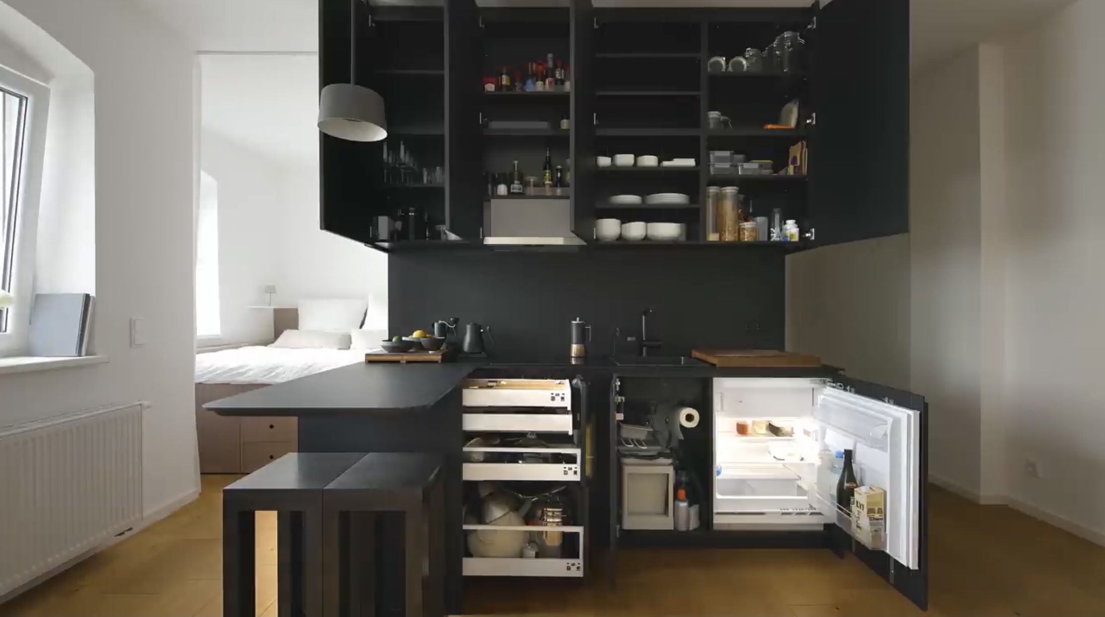 블랙 컬러가 돋보이는 부엌으로 시선을 사로잡습니다.