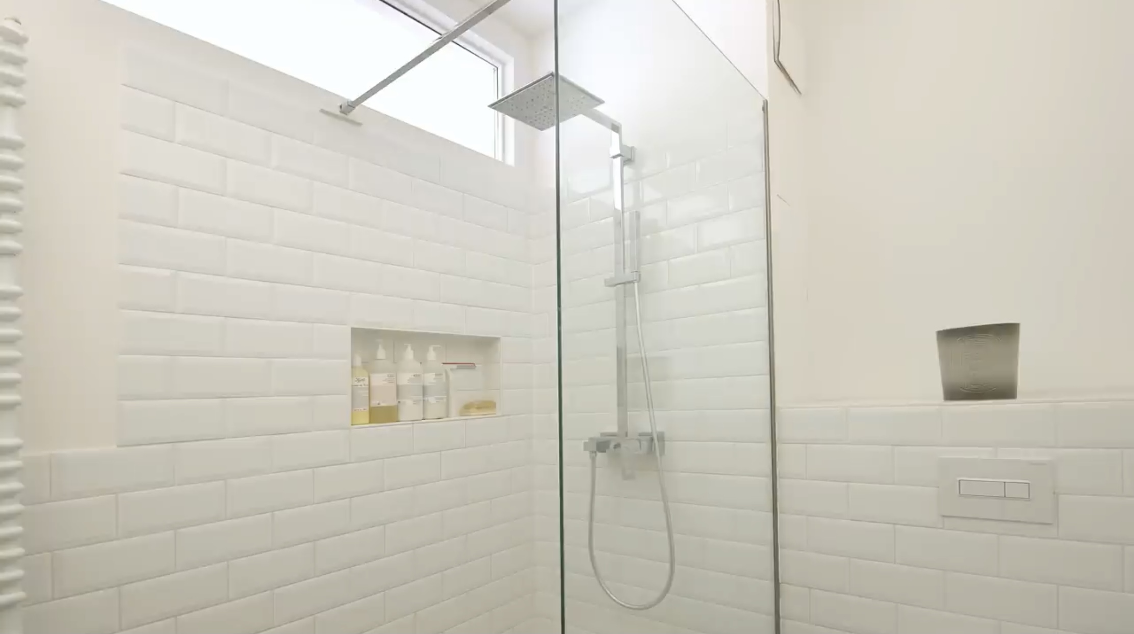 유리 가리막 샤워 부스 옆 좌변기가 설치되어 있습니다.