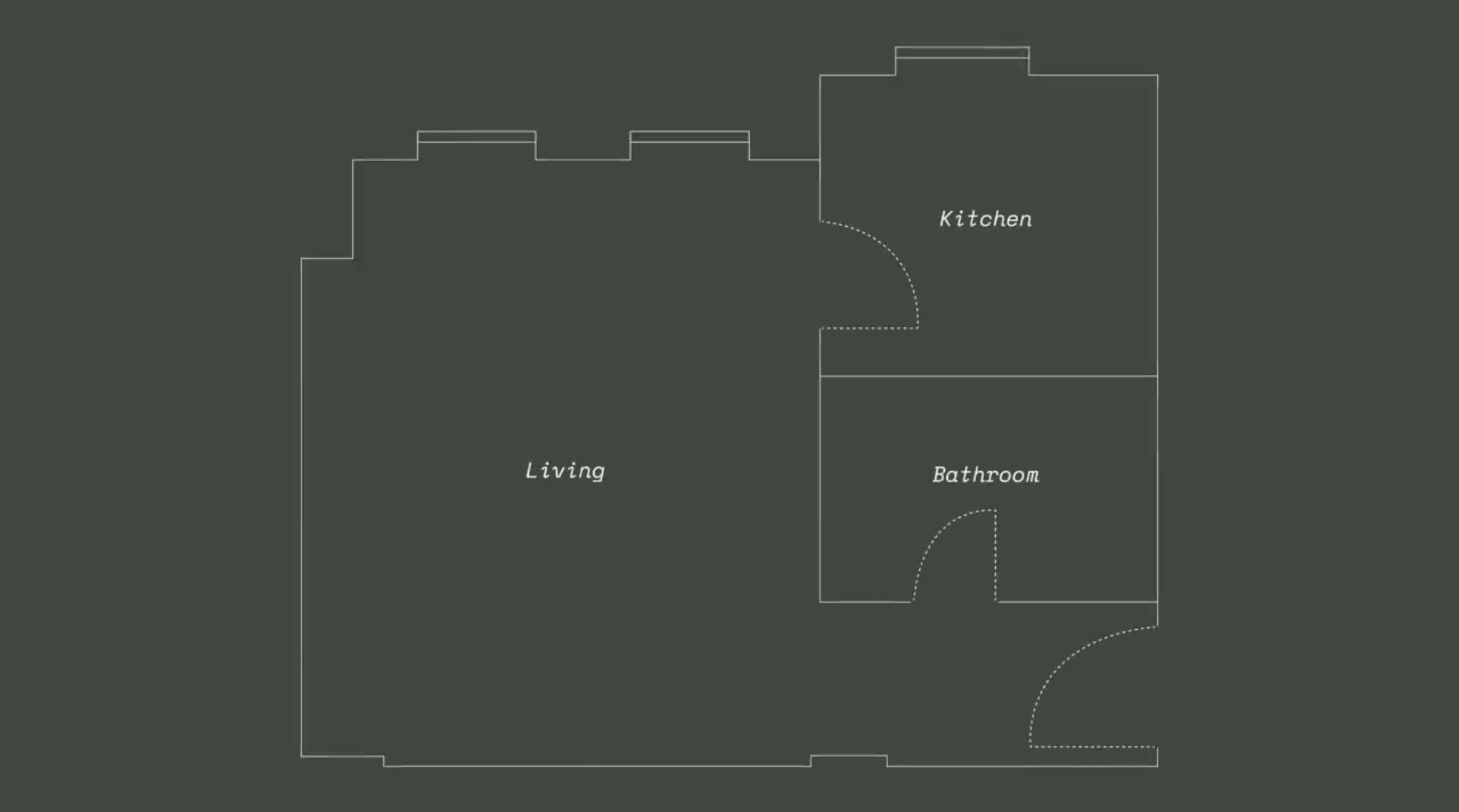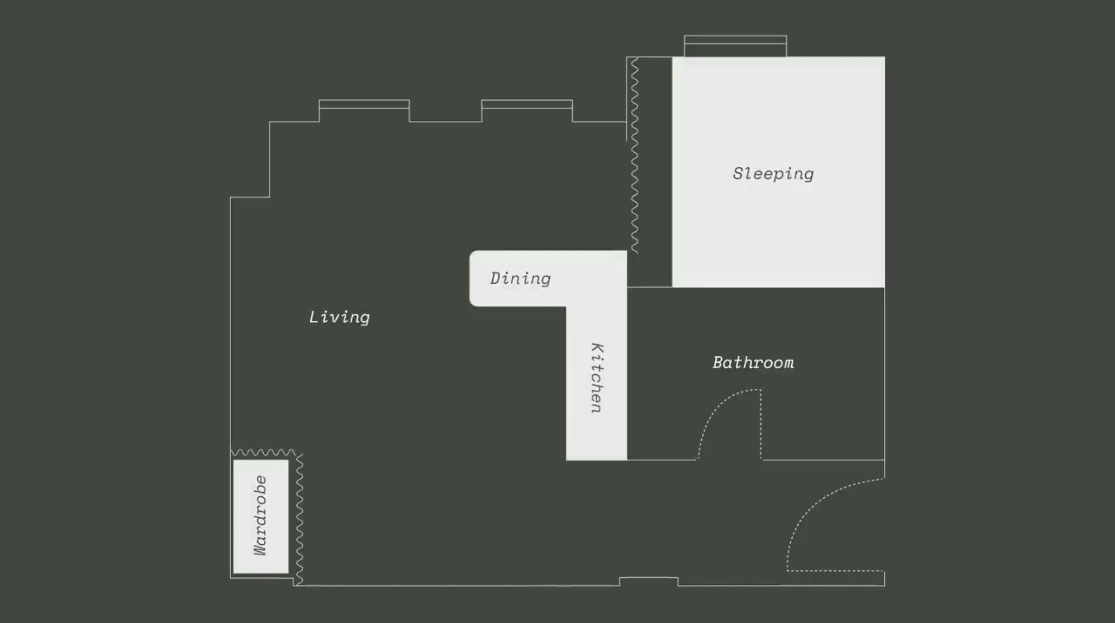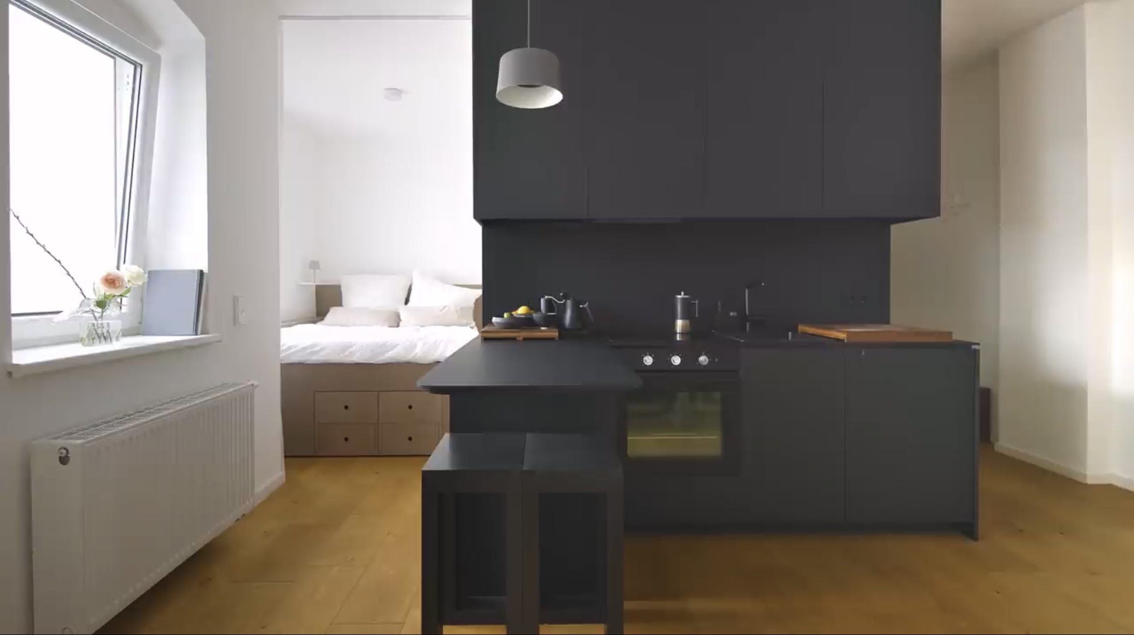 변경 후에는 화장실 공간은 그대로 두고 부엌이 있던 자리에 침실 공간을 마련했습니다.