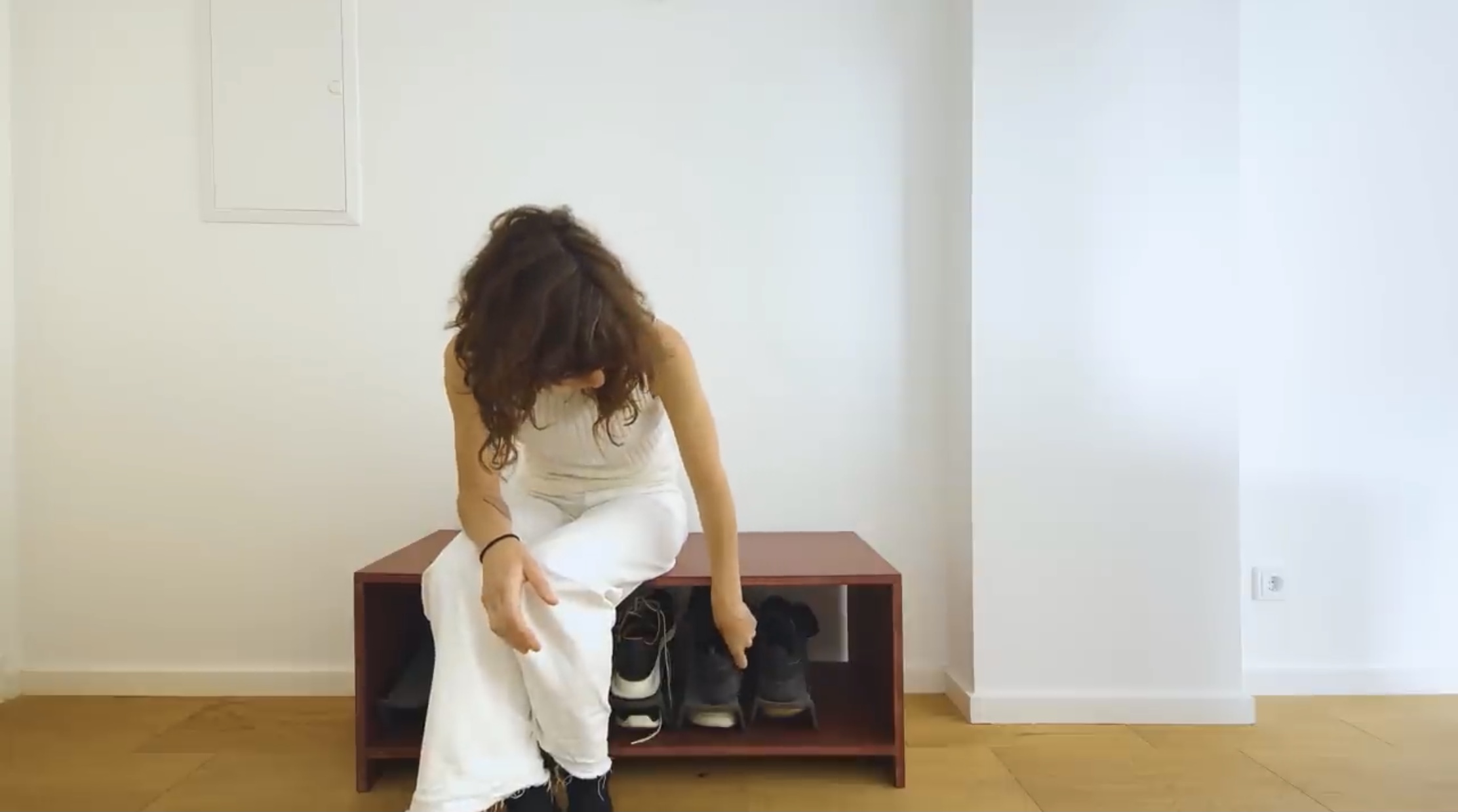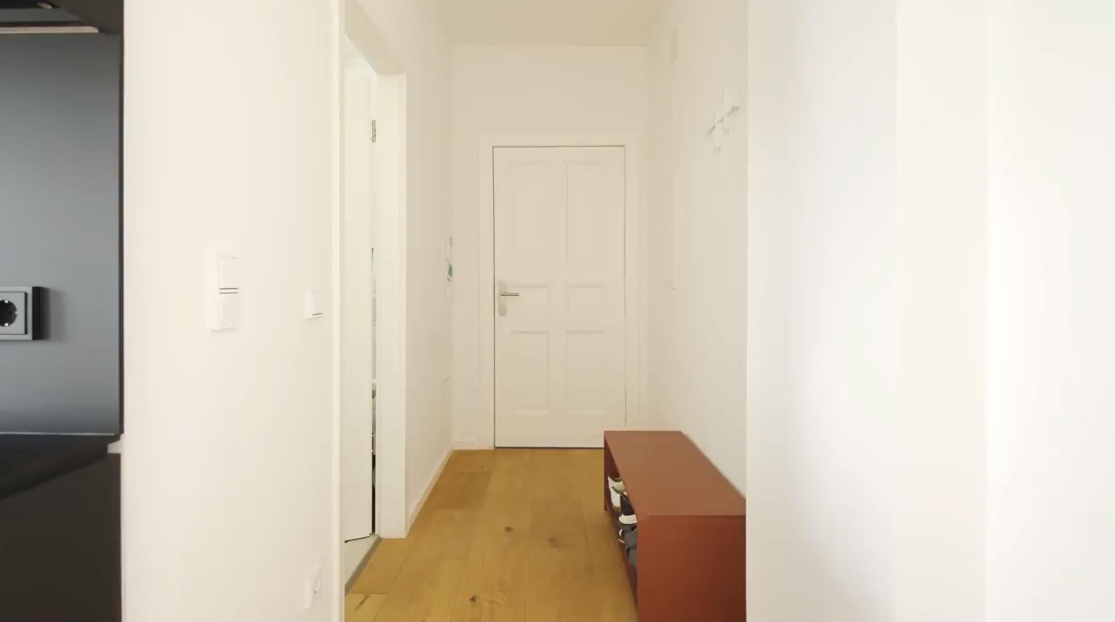 왼쪽에는 신발을 보관할 수 있는 공간이 있는 벤치가 있습니다. 이곳에서 편안하게 앉아 신발을 신을 수 있습니다.