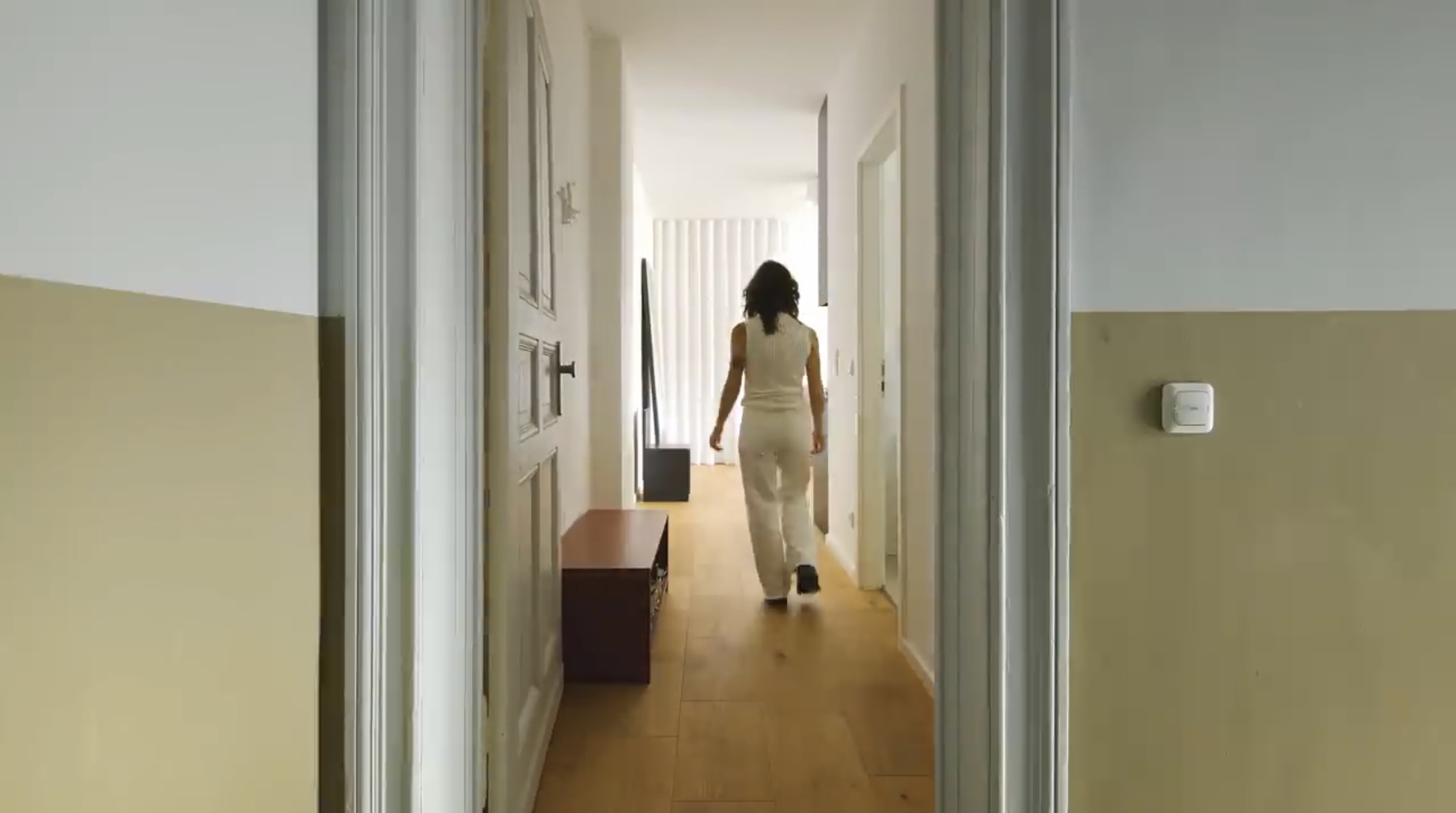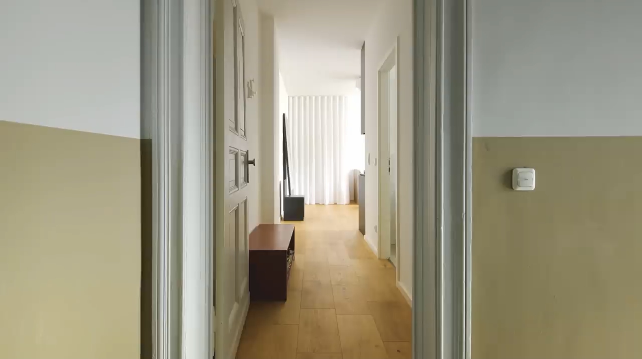 거실로 들어서면 왼쪽편에 흰색 커튼이 천장부터 설치되어 있습니다.