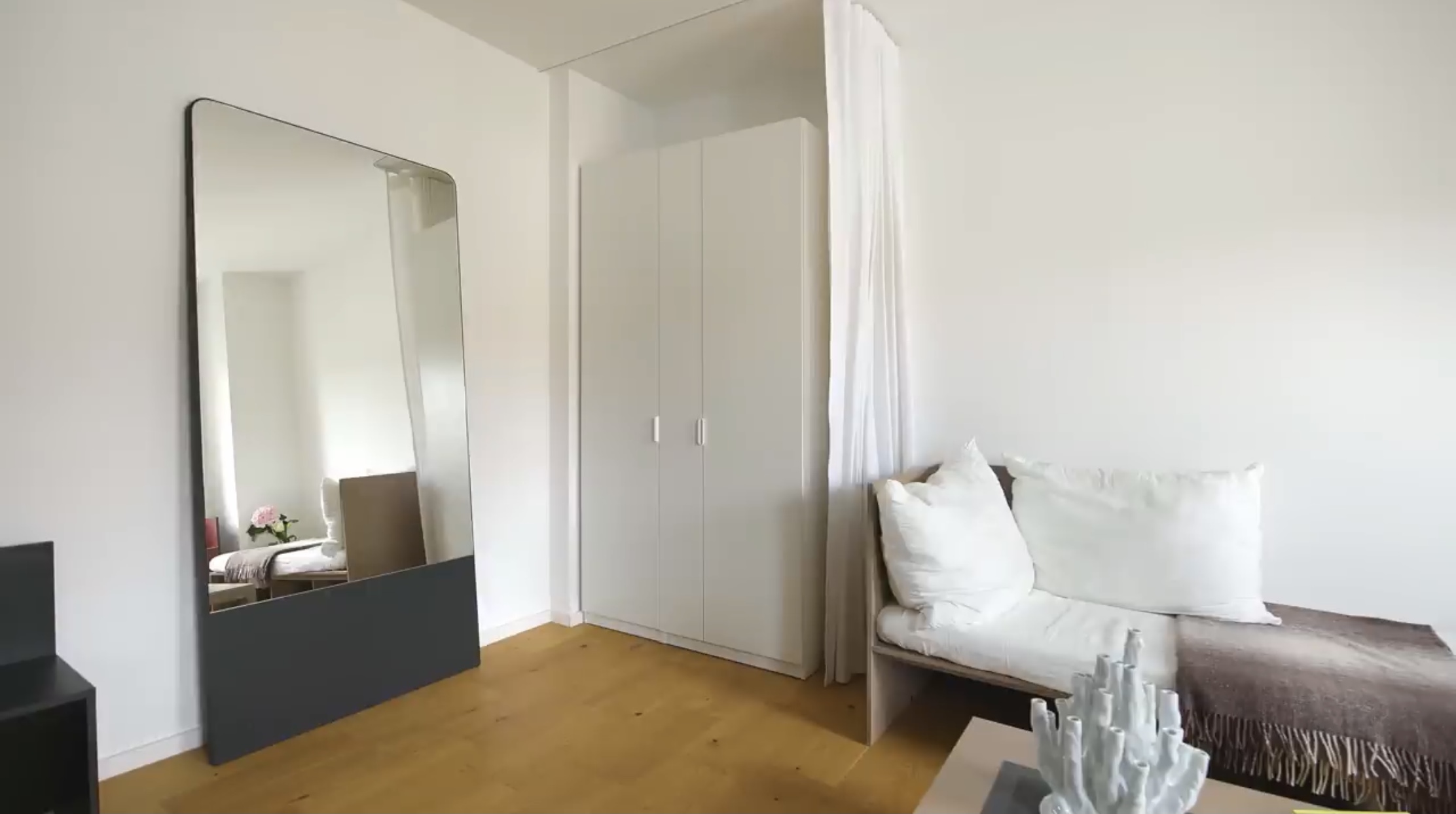 커튼 뒤에 옷장이 숨어 있습니다.