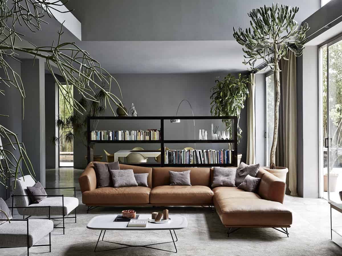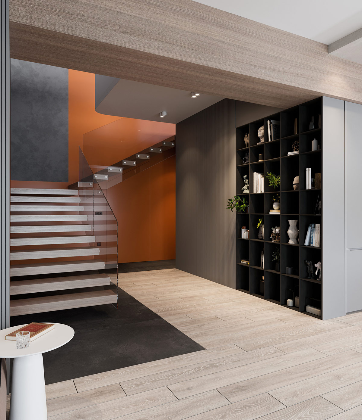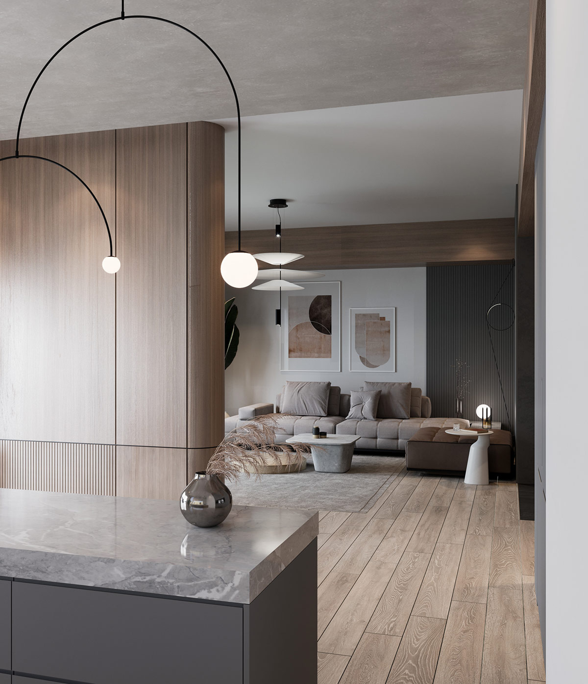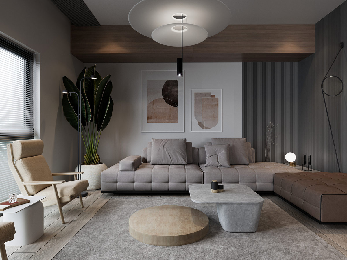 웜그레이 그라데이션과 포인트 컬러로 브라운이 들어간 인테리어