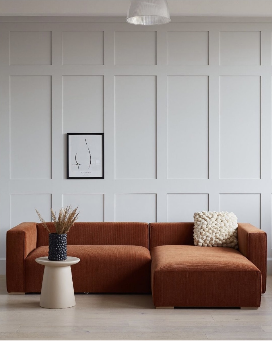 옅은 회색 벽면과 오렌지 빛이 가미된 브라운 쇼파