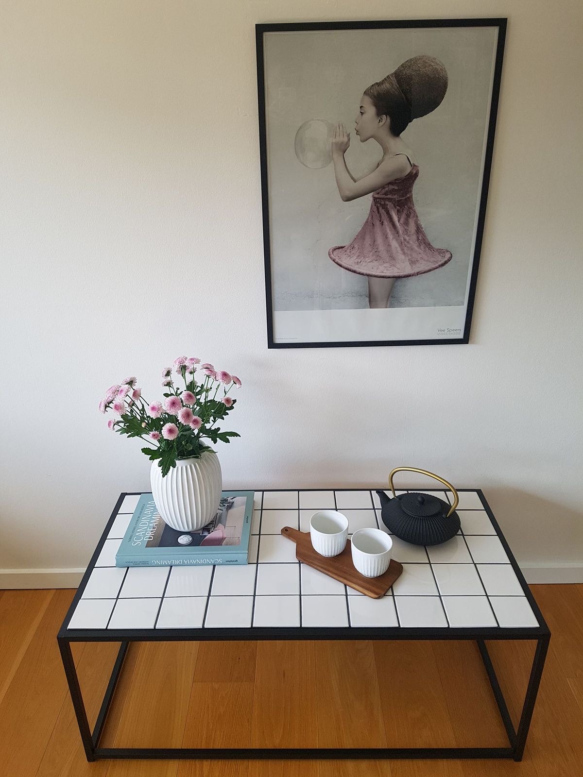 흰색타일에 그라우트 컬러를 검은색, 다리 프레임을 검은색으로 제작해 모던한 느낌을 줍니다.