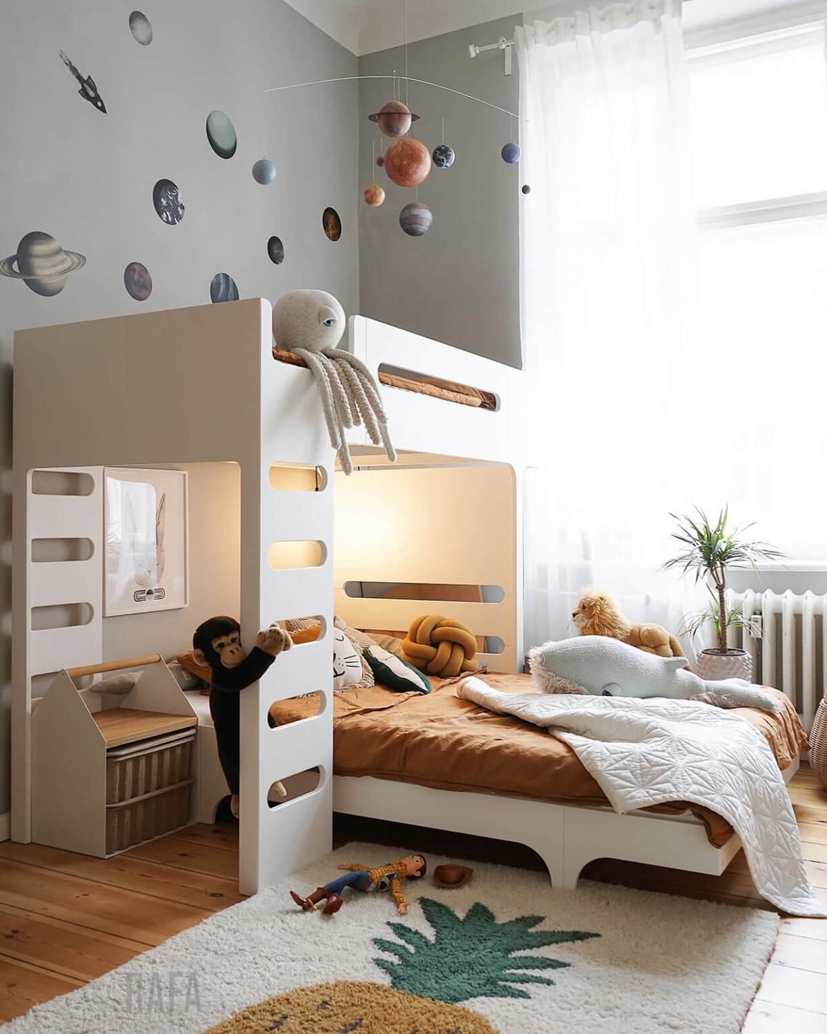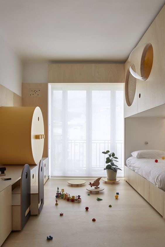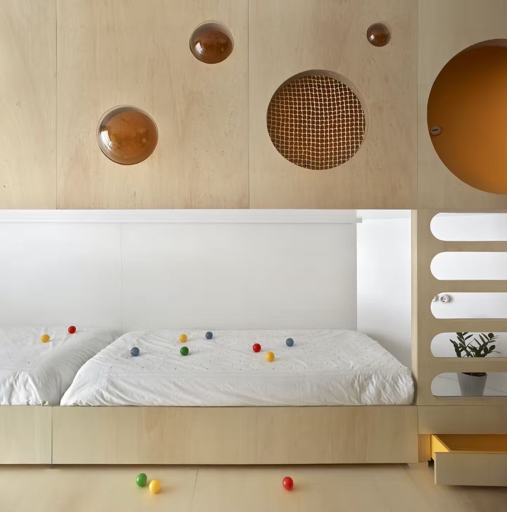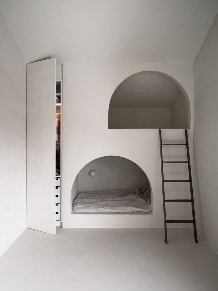 반달모양의 이층 침대와 왼편에 긴 수납장