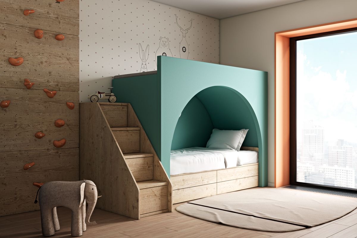 반달모양의 이층 침대와 왼편에 긴 수납장