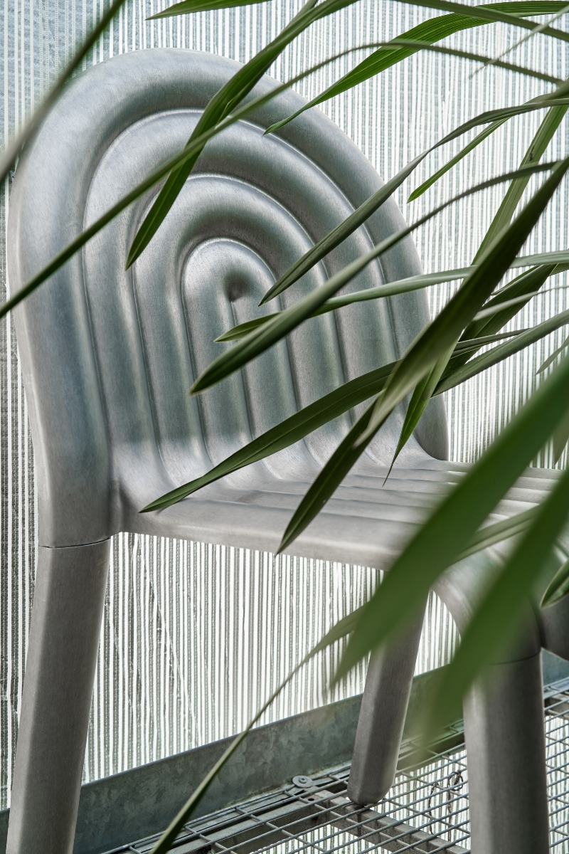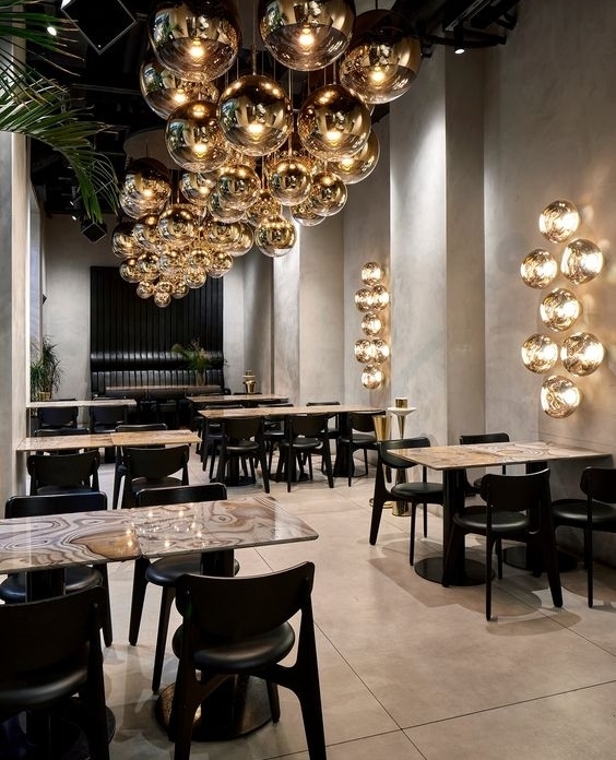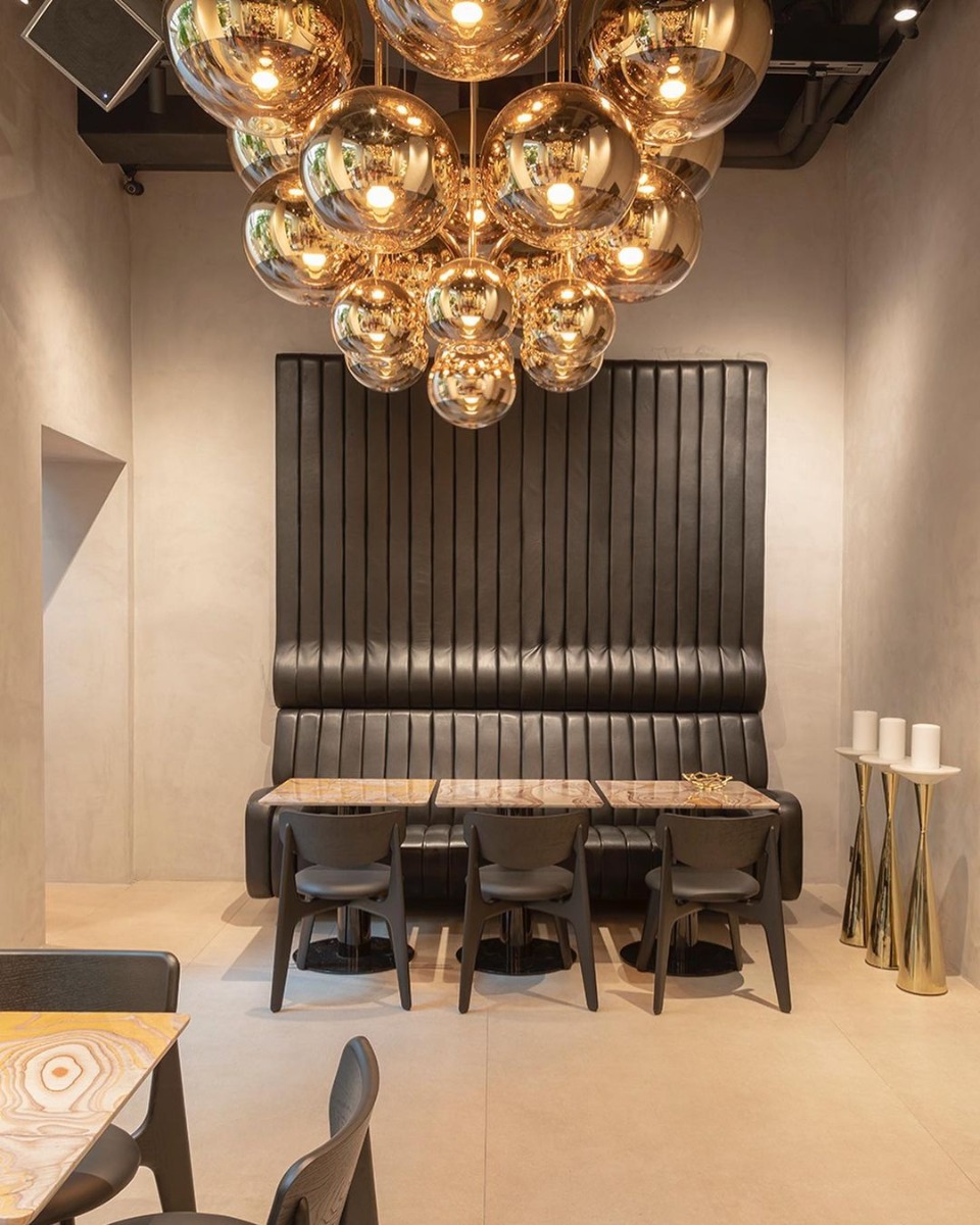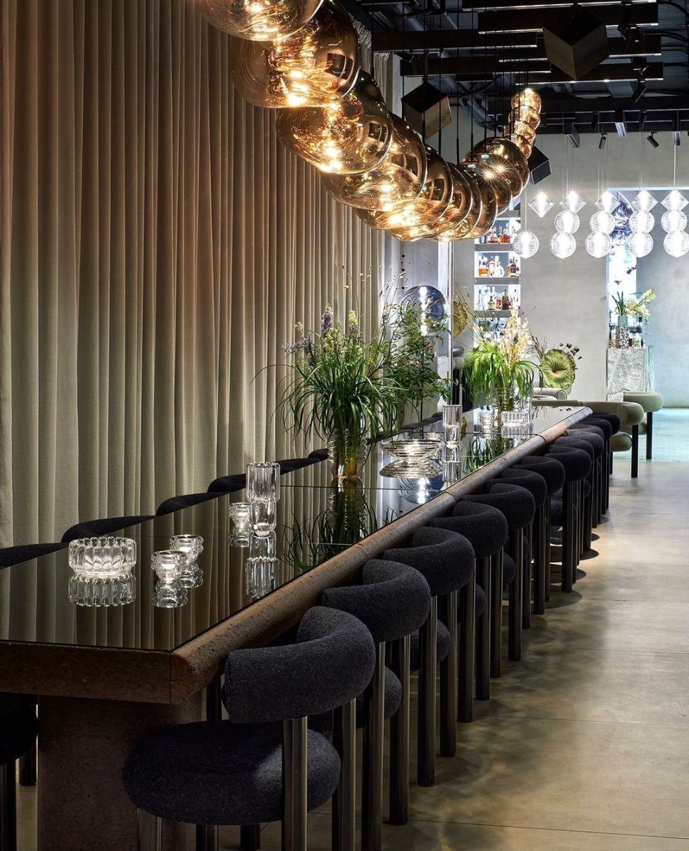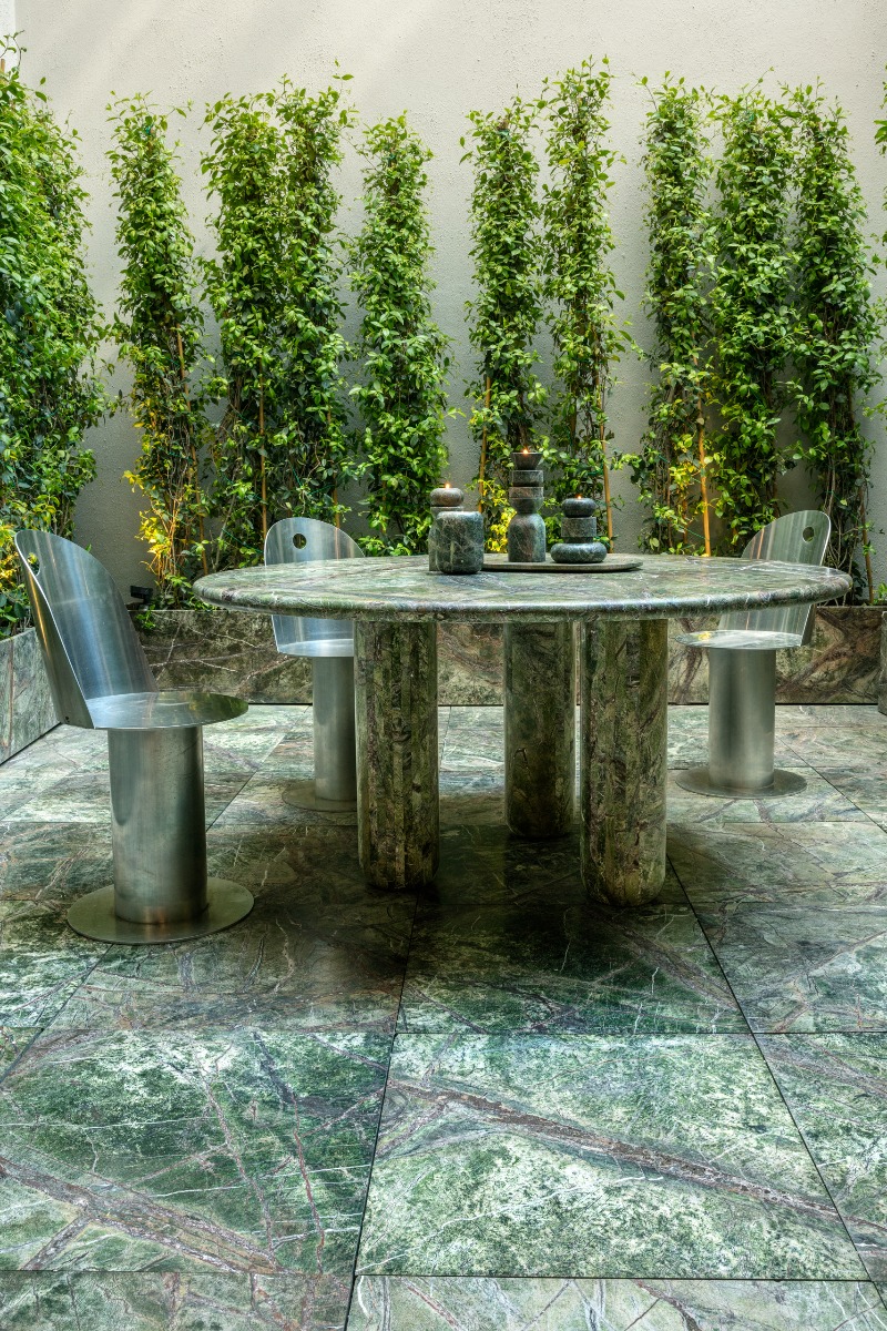 갤러리는 골드 조명과 식물로 가득 차 있습니다. 최신 melt 샹들리에가 윙백 체어 위에 매달려 있고, 톰 딕슨이 디자인한 제품과 함께 여유롭게 커피를 즐길 수 있습니다. 안뜰에는 톰 딕슨의 대리석 녹색 조각과 어우러진 맞춤형 포레스트 그린 대리석 테이블이 자리 잡고 있습니다.