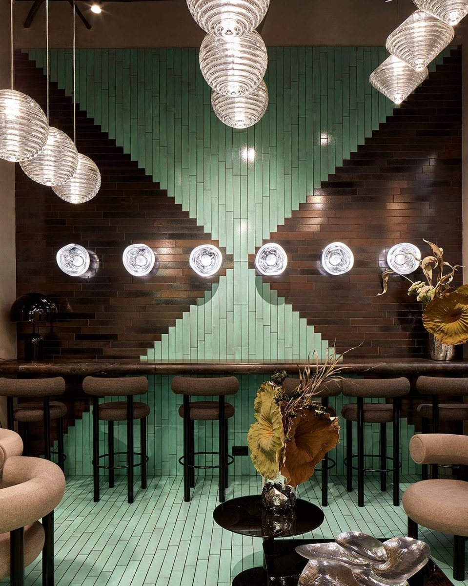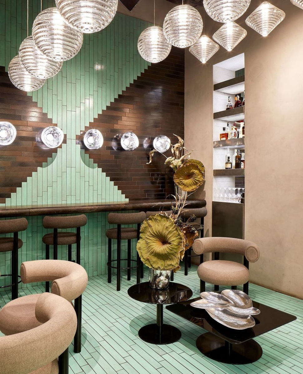 모놀리식 화강암과 시칠리아 용암이 만나는 벽면은 화강암 타일은 민트 그린 바닥 타일과 대조를 이루며 톰 딕슨의 라운지 의자와 바 스툴과 조명과 어우러집니다.