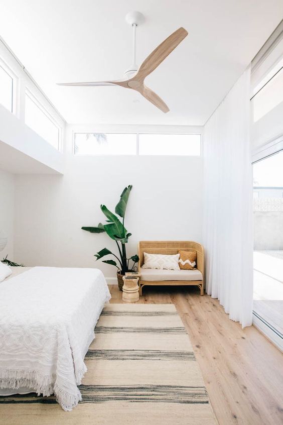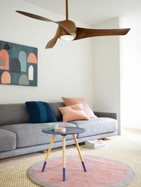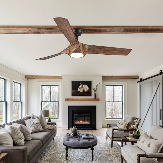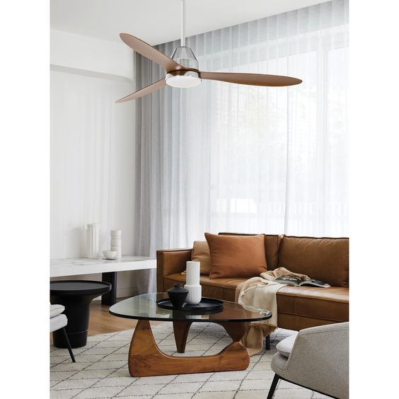 우드 실링팬은 화이트와 브라운 거실 인테리어에 잘 어울립니다.