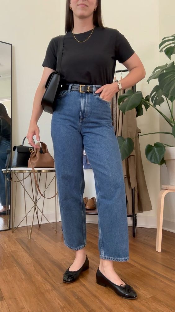 청바지와 검은색 상의를 매치한 스타일에 노란색 핸드백과 구두가 포인트가 되어 주목을 받습니다. 이러한 컬러 매치는 단순함 속에서도 개성을 드러내며, 패션에 있어서 세련된 감각을 보여줍니다. 노란색 액세서리는 전체적인 룩에 활력을 불어넣으며, 스타일리시한 분위기를 연출하는 데 일조합니다.