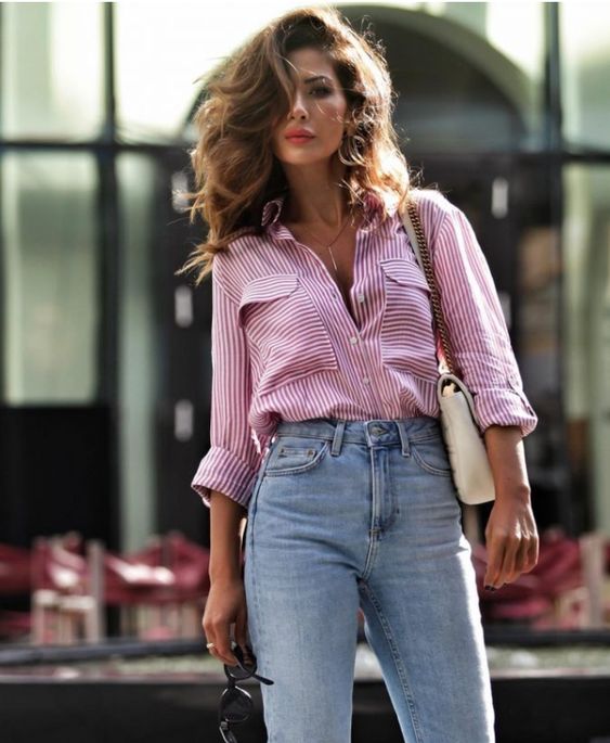 청바지와 핑크색의 조합은 평범하지 않은 컬러 매치로 활기차고 독특한 스타일을 선보이며, 세련되게 눈에 띕니다. 이 조합은 다른 컬러 조합보다 젊은 이미지를 연출하여 보는 이로 하여금 더 젊어 보이는 인상을 줍니다. 핑크색 줄무늬가 있는 셔츠는 그 자체의 색상이 주는 생동감으로 깔끔하면서도 개성 있는 스타일을 완성합니다.