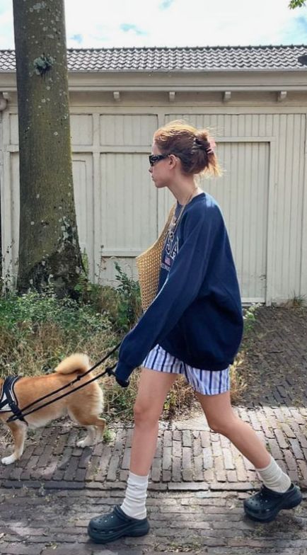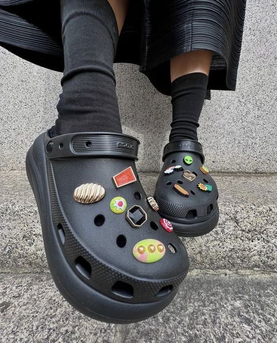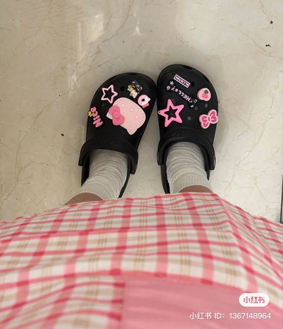 블랙핑크의 지수가 블랙 크록스에 자신의 이니셜 'JS'를 달아 멋지게 꾸몄습니다.