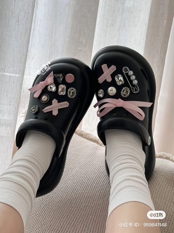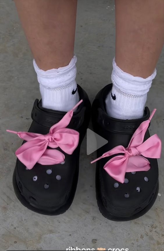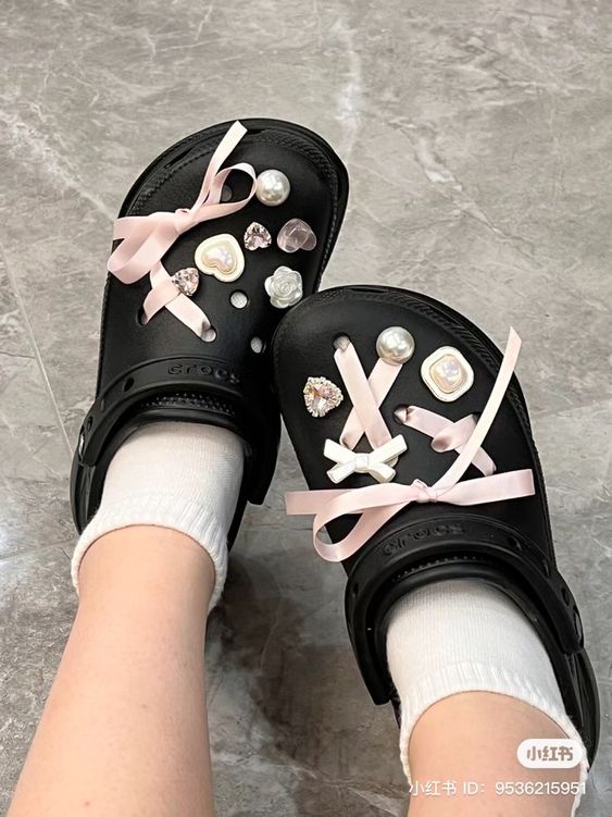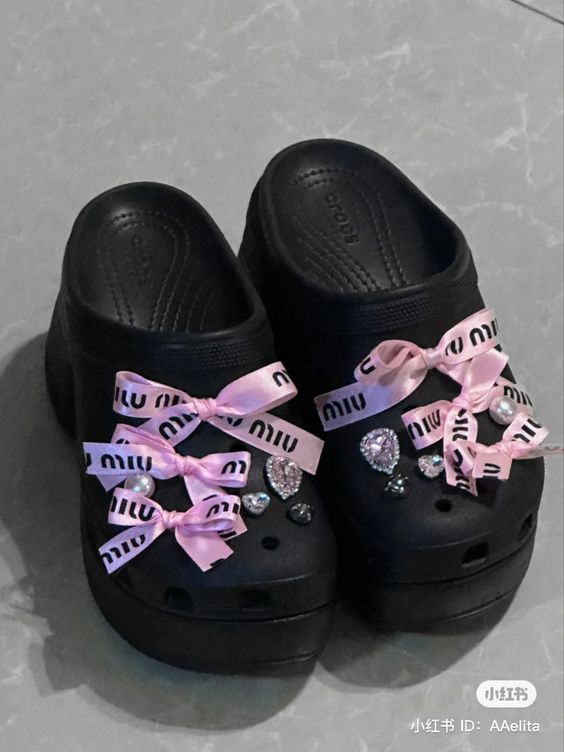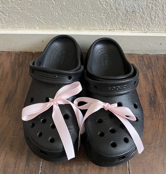 블랙 크록스에 핑크색 리본이 달린, 사랑스럽게 장식된 크록스