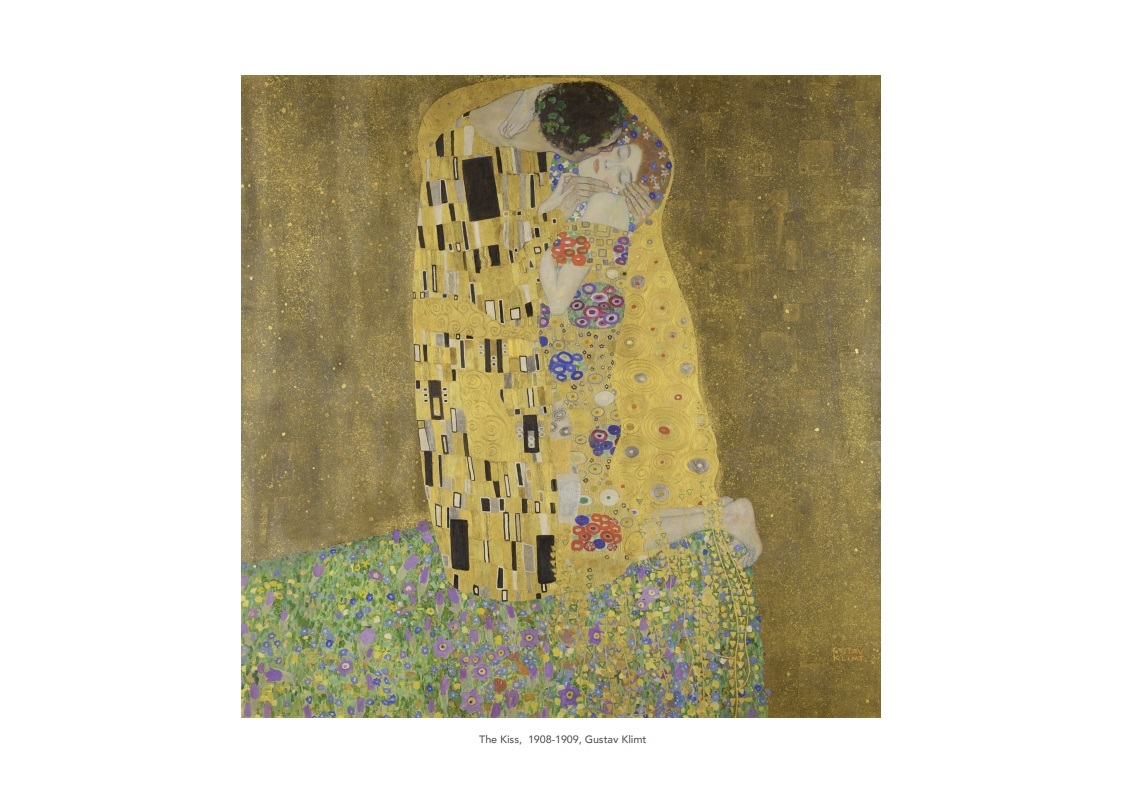 8. 구스타프 클림트의 키스: 황금빛 배경과 사랑을 나누는 인물들의 아름다운 조화가 돋보이는 작품입니다.