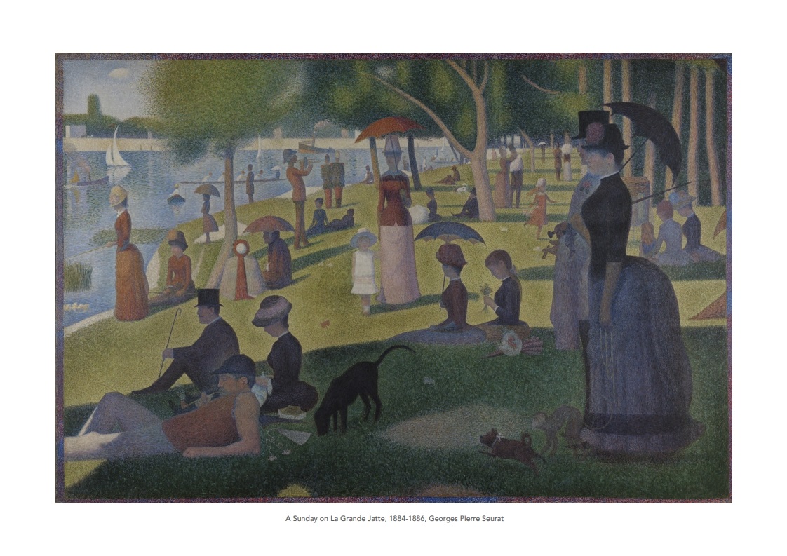 6. 조르주 쇠라의 그랑드 자트 섬의 일요일 오후: 점묘법을 사용한 이 작품은 고요한 일요일 오후의 풍경을 세밀하게 묘사합니다.