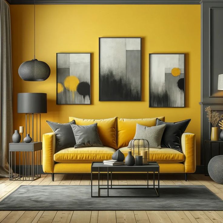 거실: 회색 소파에 노란색 쿠션을 더하면 세련되면서도 따뜻한 느낌을 줄 수 있습니다. 또한, 회색 벽에 노란색 그림이나 포스터를 걸어두면 시각적인 포인트가 됩니다.