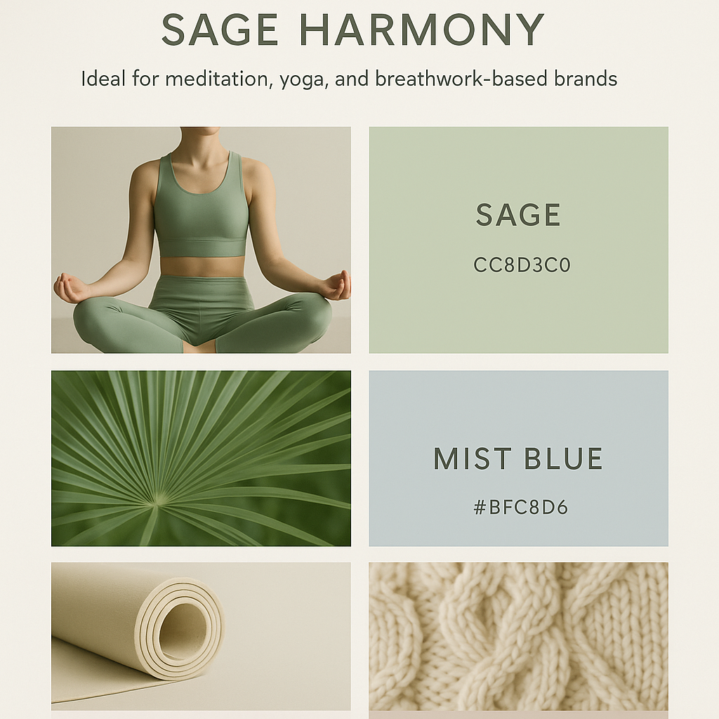 이 팔레트는 명상·요가·호흡 기반 브랜드에 특히 적합하다. 색들이 모두 저채도 중명도 영역에 있어 시선에 부담을 주지 않으며, 사용자 인터페이스나 패키지 디자인에서 ‘부드러운 기류’를 만든다. 브랜드의 핵심 감정선을 ‘회복과 안정’으로 설정할 때 이상적이다.