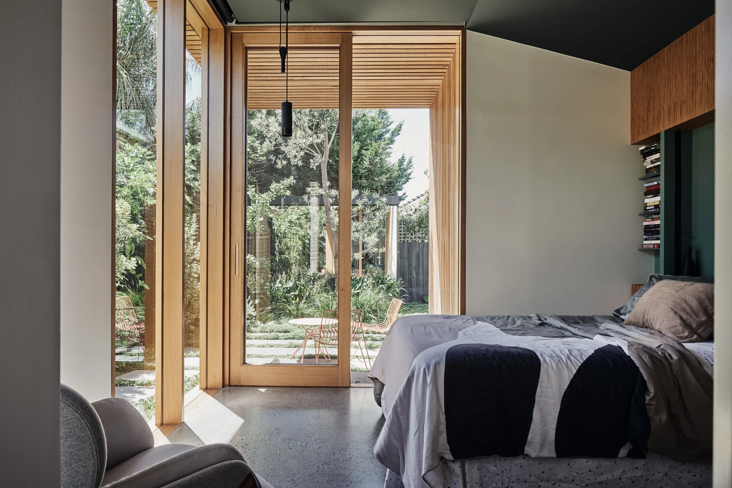 침실 또한 정원 정원에 둘러 쌓여 있으며 나무 물결 천장의 연장선에 있습니다.