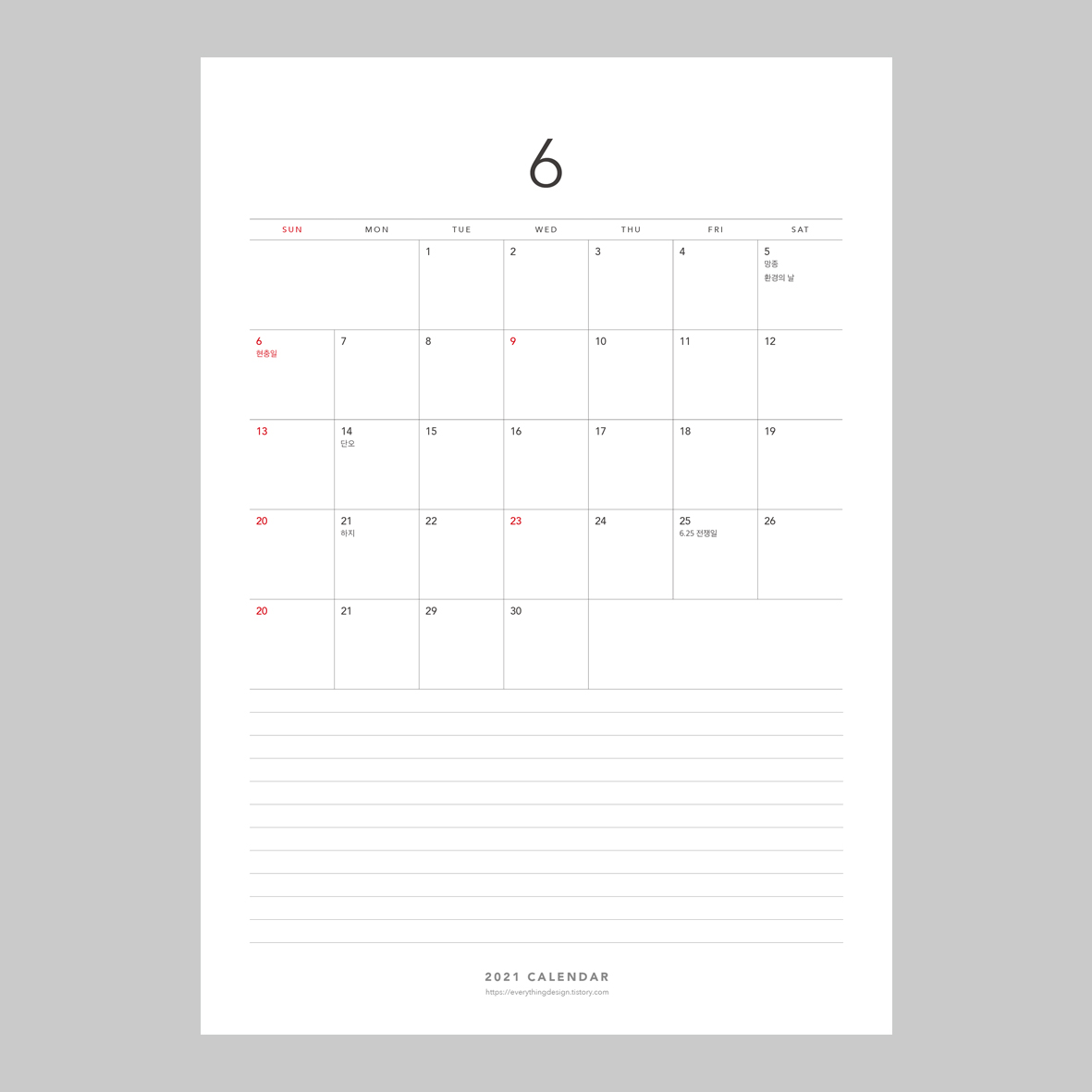 1. 첫 번째 버전은 날씨와 휴일은 빨간색으로 표시된 캘린더입니다. 6월 한 달을 전체적으로 볼 수 있습니다. 날짜별 메모가 가능하고, 하단에는 6월 목표, 해야 할 일, 체크리스트 등 메모를 할 수 있는 공간이 있어 활용도가 좋습니다. 줄 간격은 7mm로 메모하기 좋은 간격으로 디자인되었습니다.
