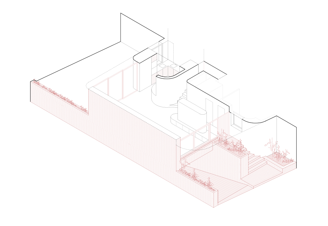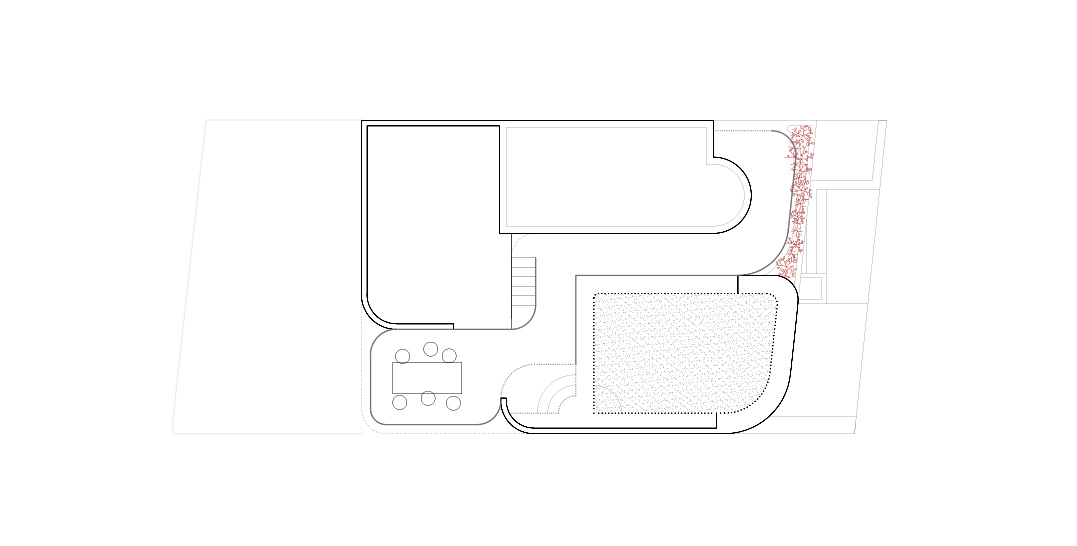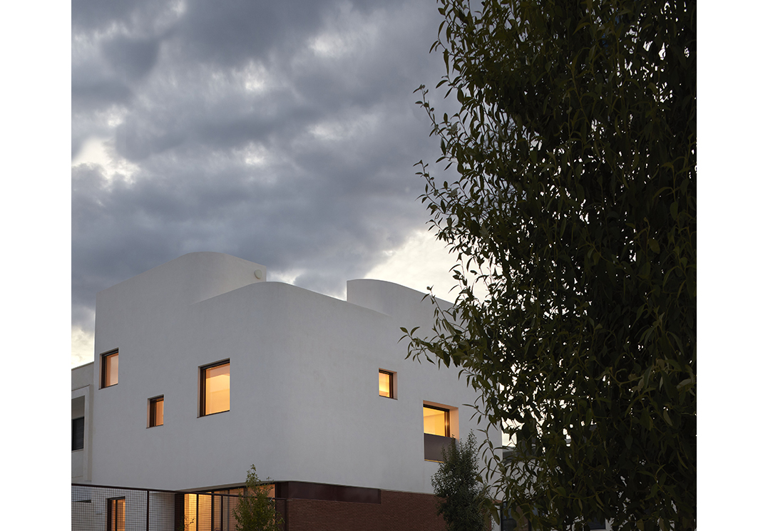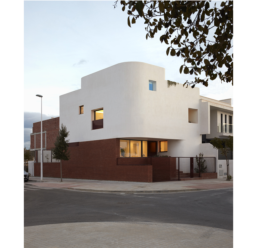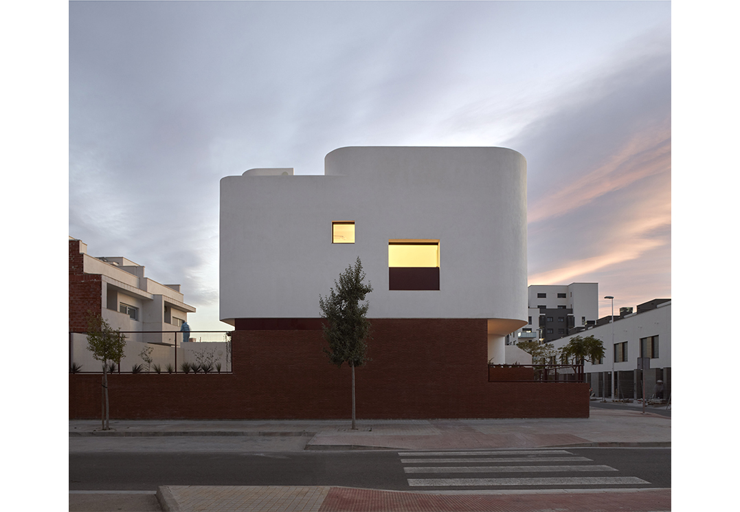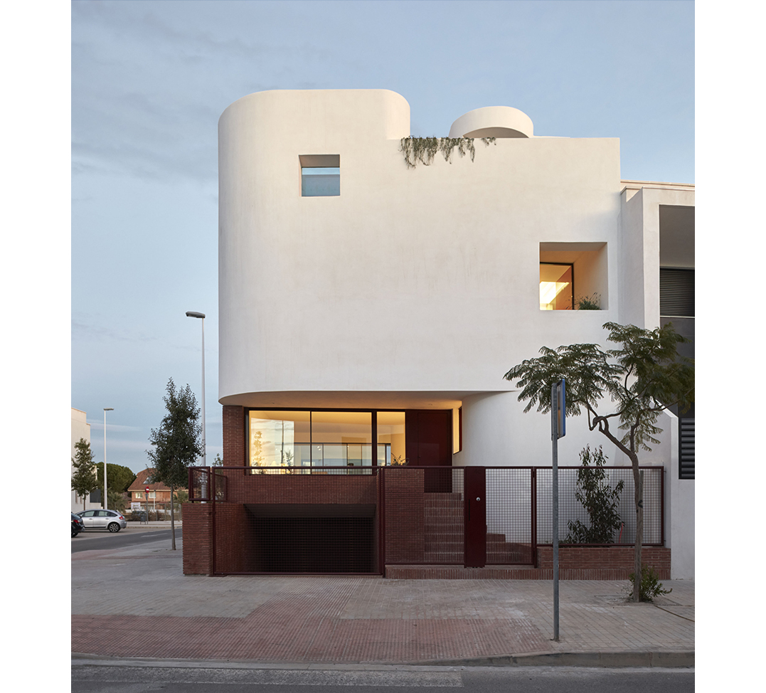 빨간 벽돌 베이스에 모서리가 둥근 화이트 볼륨이 올라간 매력적인 집입니다.