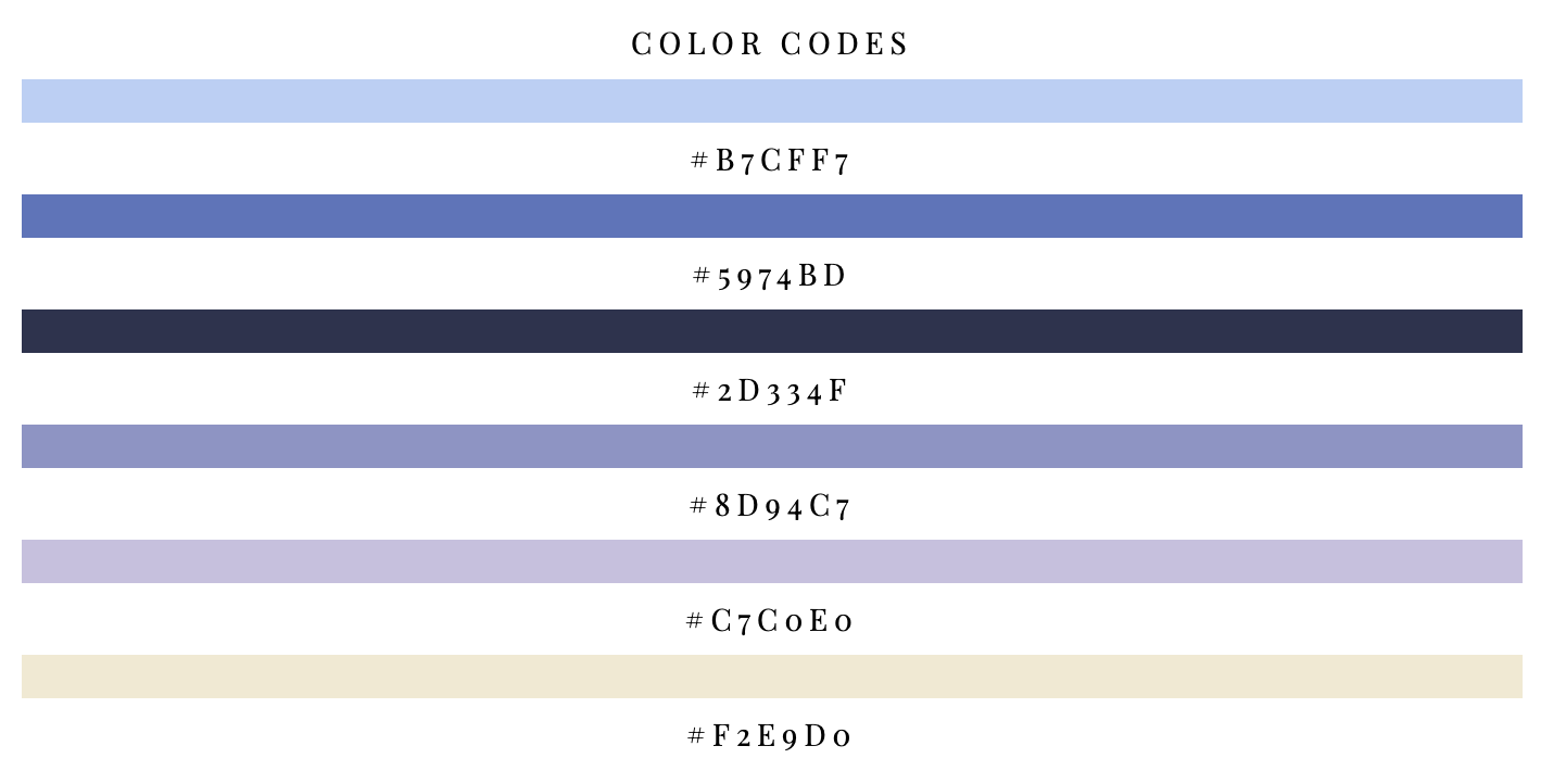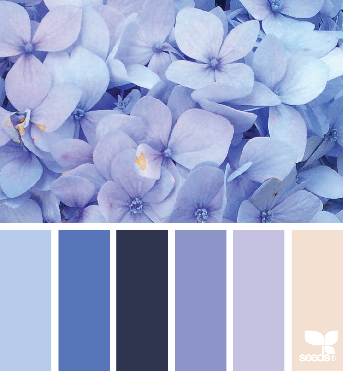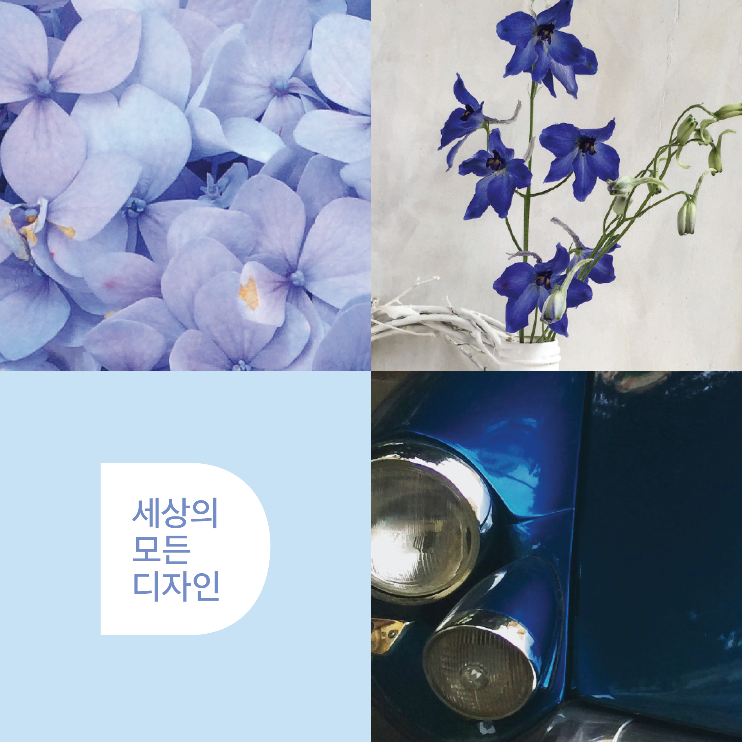 파란색, 연한 파란색, 파스텔 연보라색과 살구빛 색의 조화는 따뜻한 느낌을 주어 파란색이 주는 차가운 느낌을 보완해 줍니다.