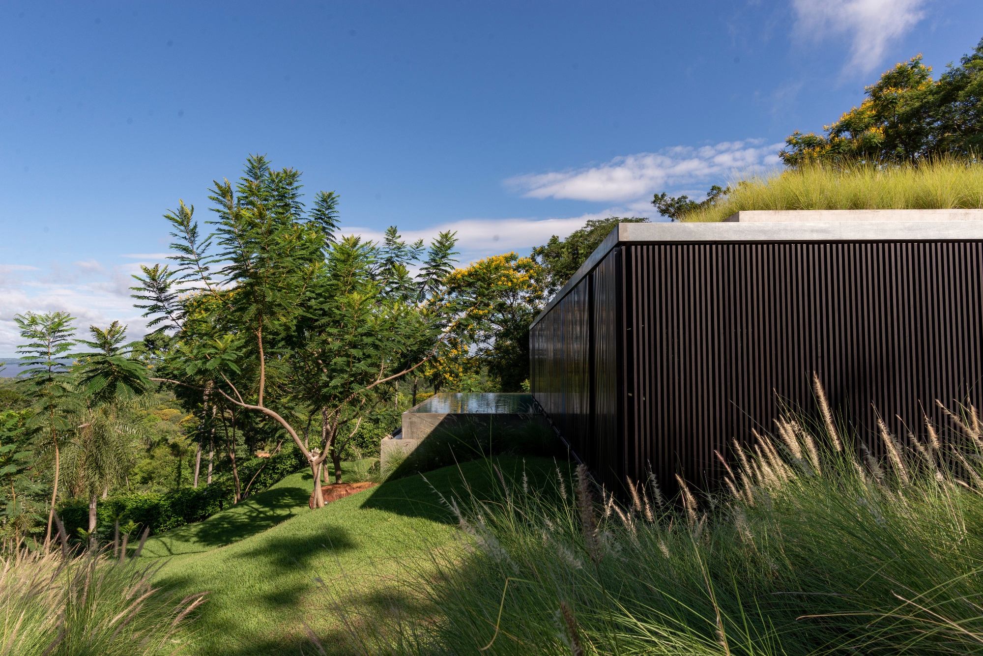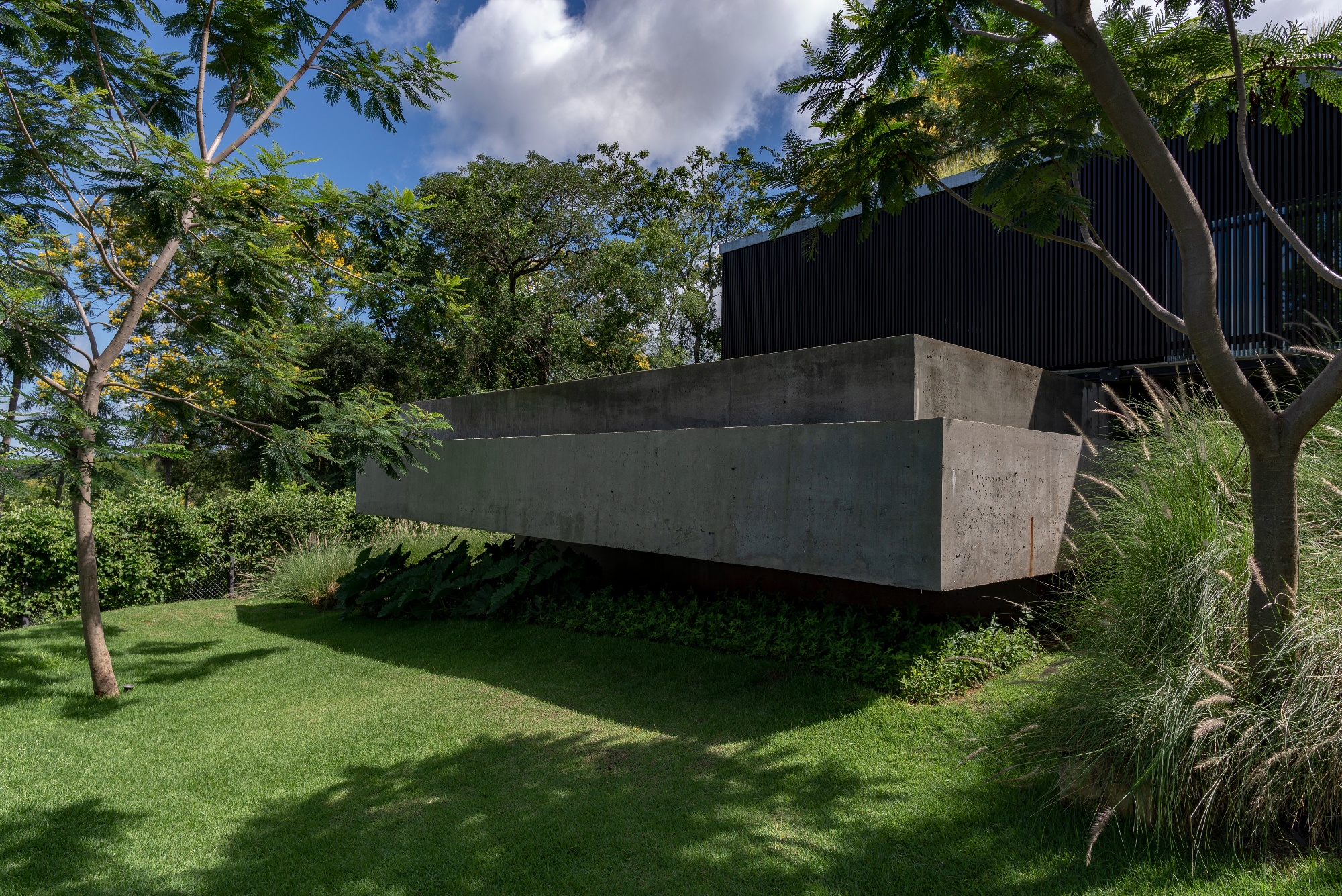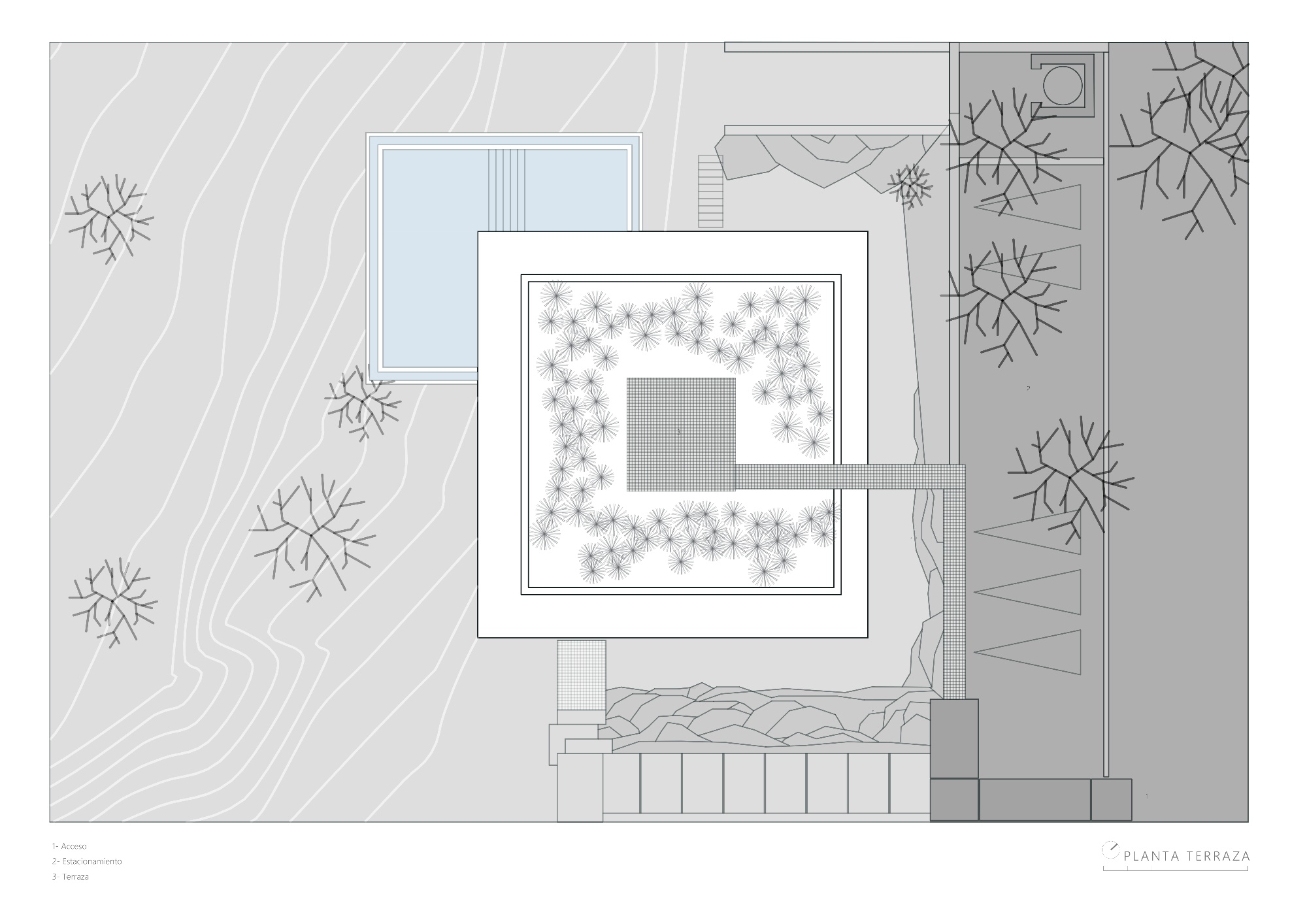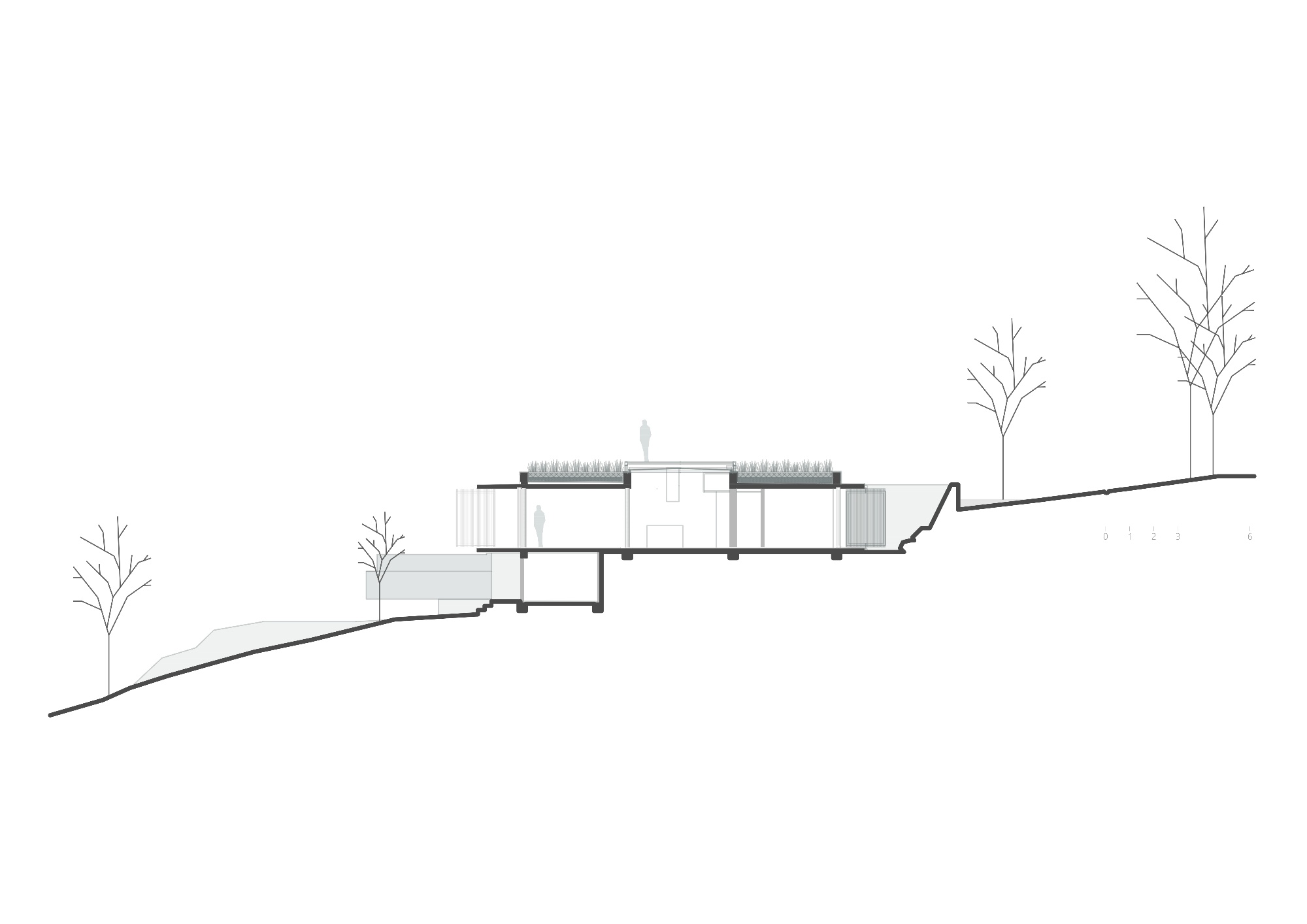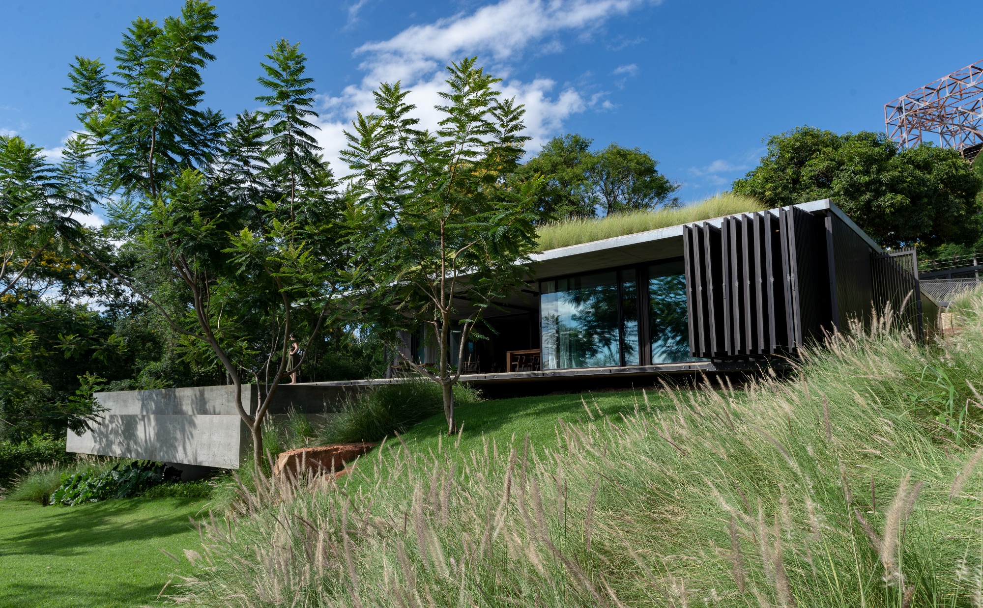 불규칙한 경사면에 자리한 정사각형 집입니다.