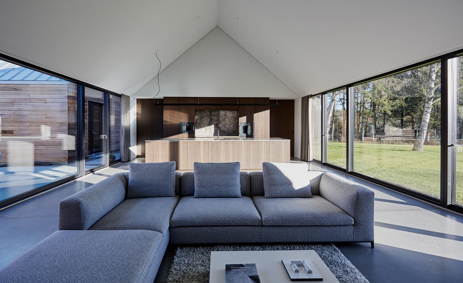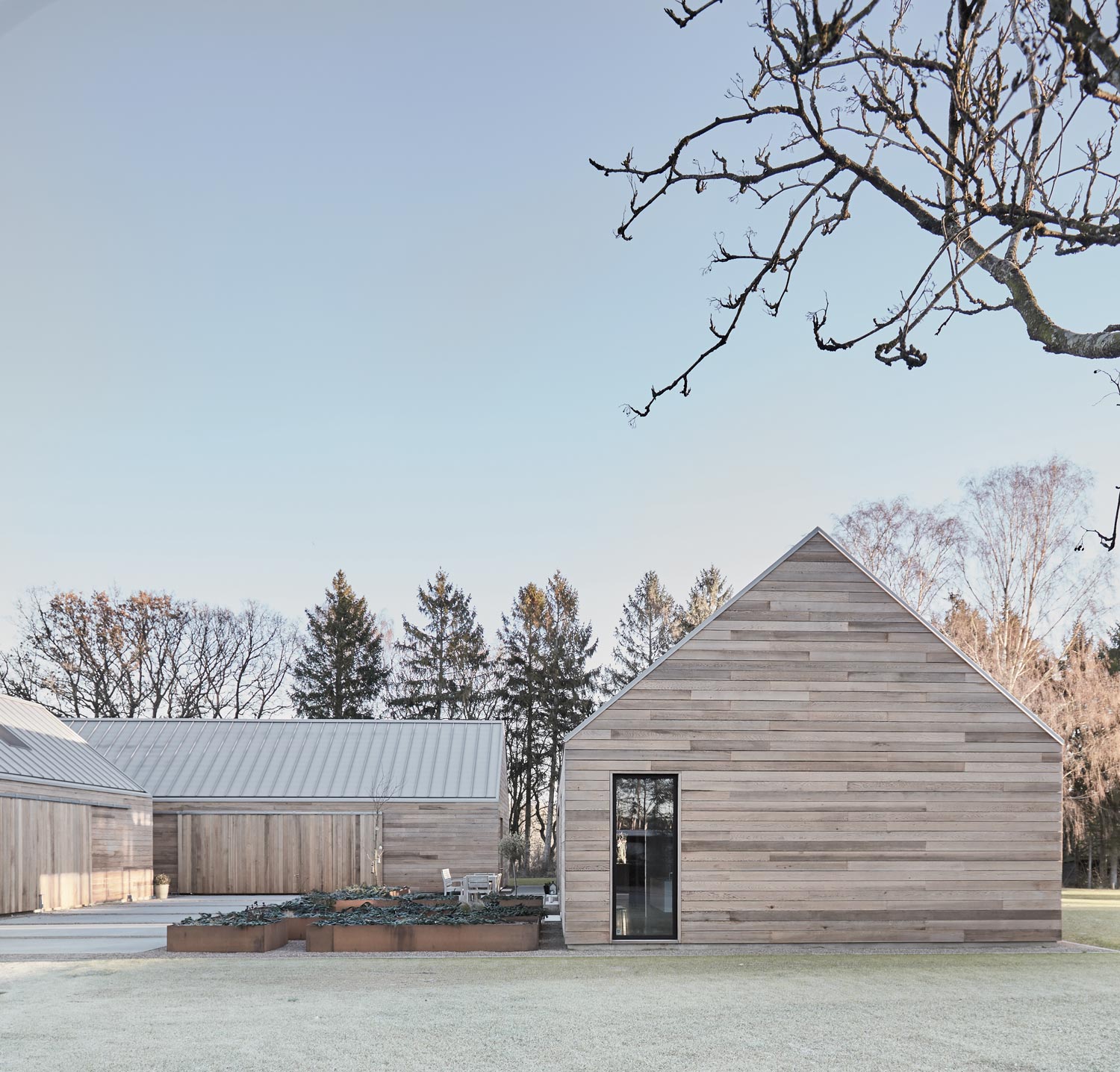 3개의 볼륨은 각각 메인 주택과 매를 위한 헛간 그리고 차고와 세미나 겸용 공간으로 나뉩니다.