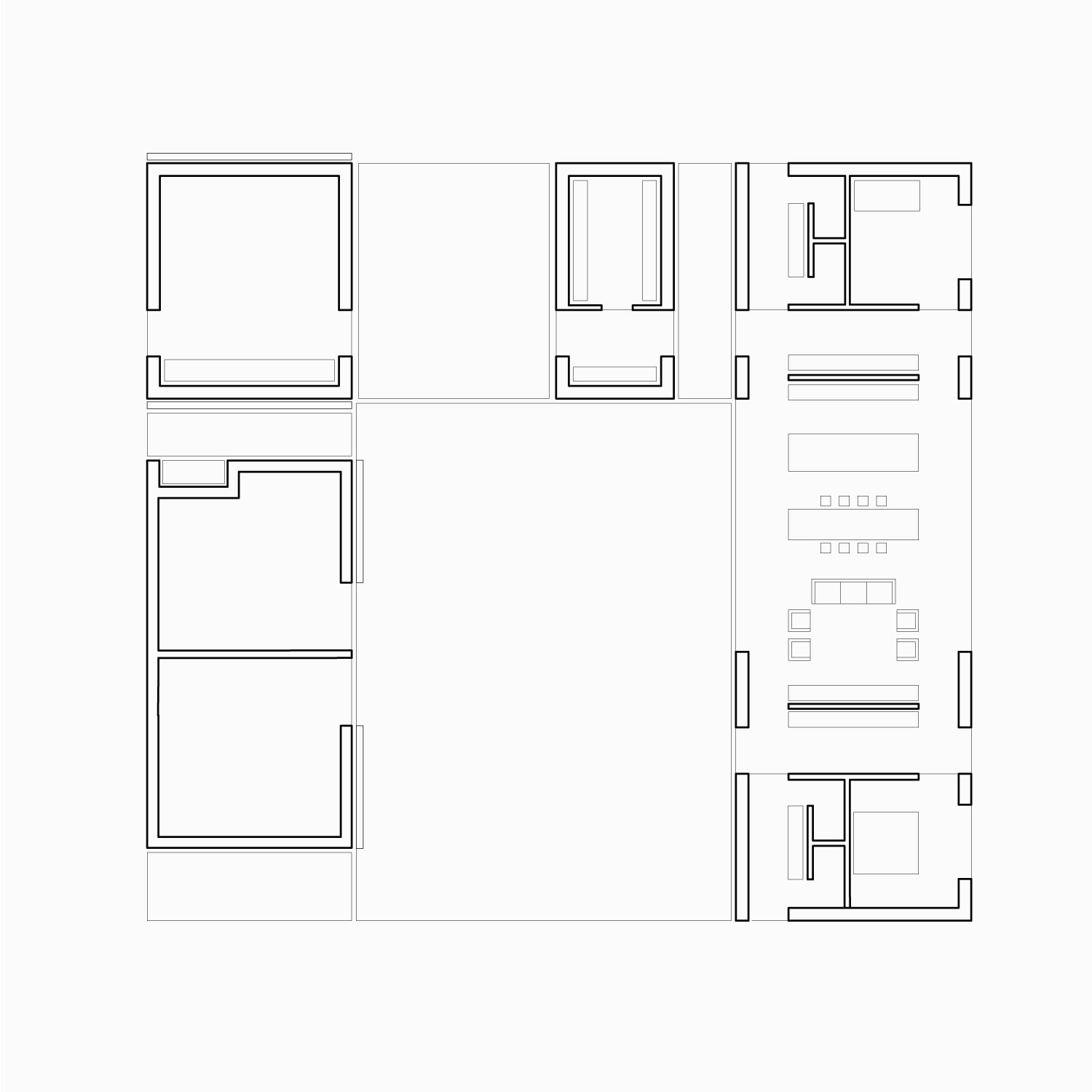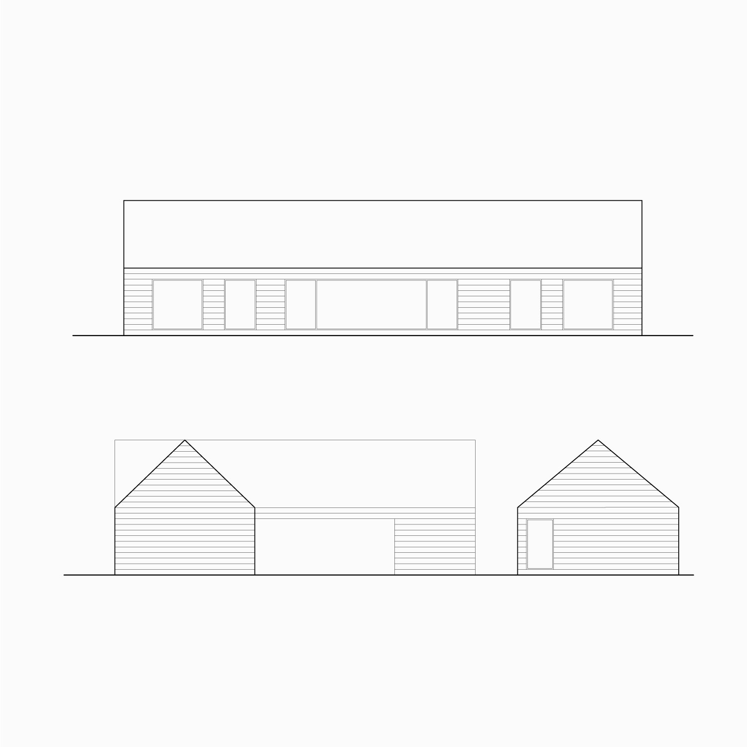 본채는 앞뒤로 큰 창을 두어 개방감이 있는 형태이고 나머지 두채는 개방감 없이