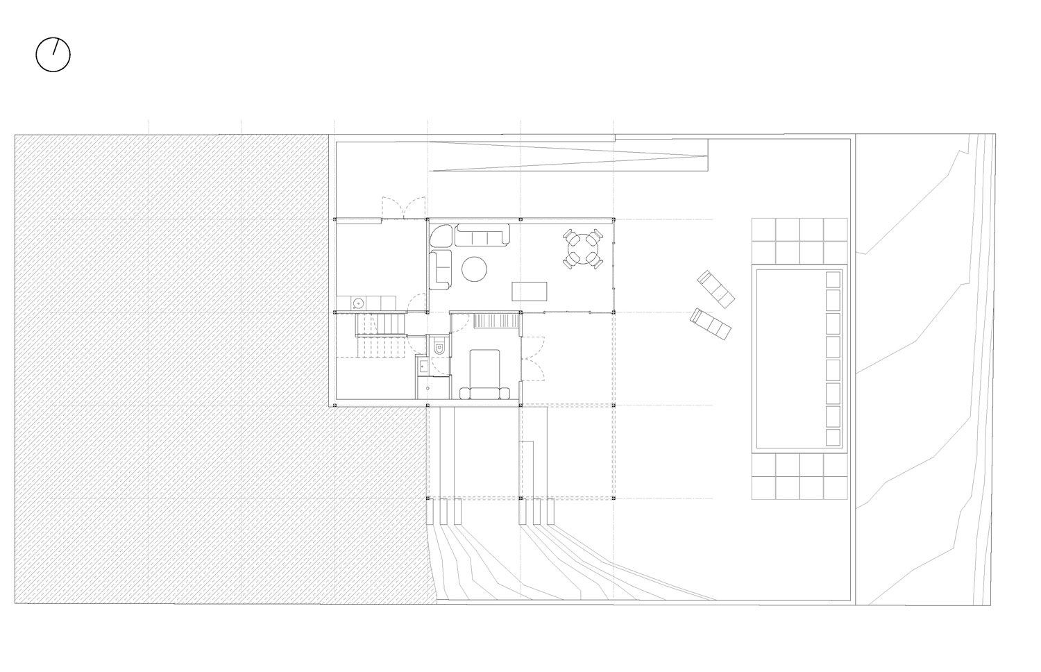 제일 아래층에는 수영장을 향해 있는 침실 하나와 가족실이 그리고 2층에는 주방과 식당, 거실이