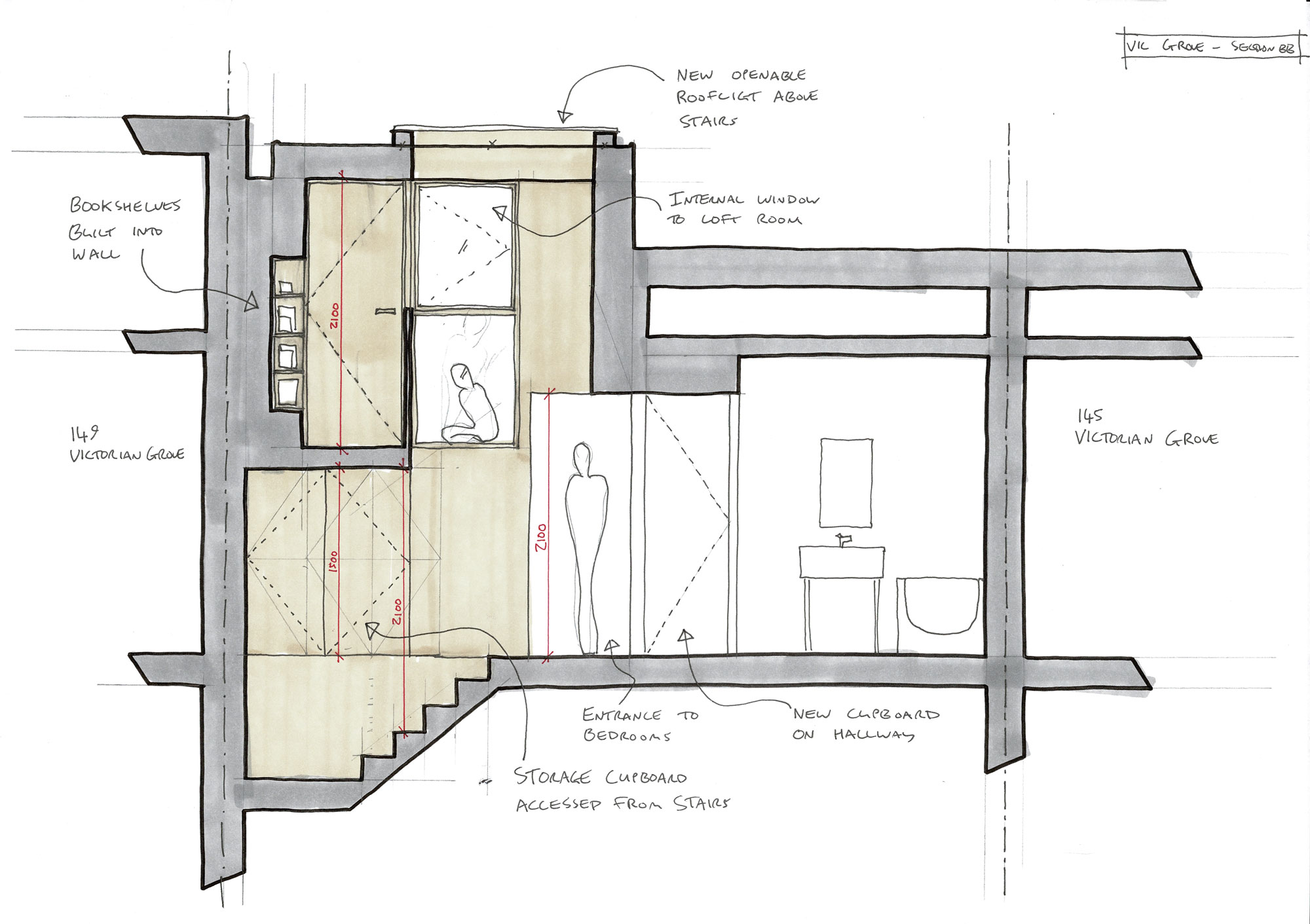 기존의 2층 주택에서 공간을 확보하기 위해 2층의 비활동 공간의 천장을 낮추고