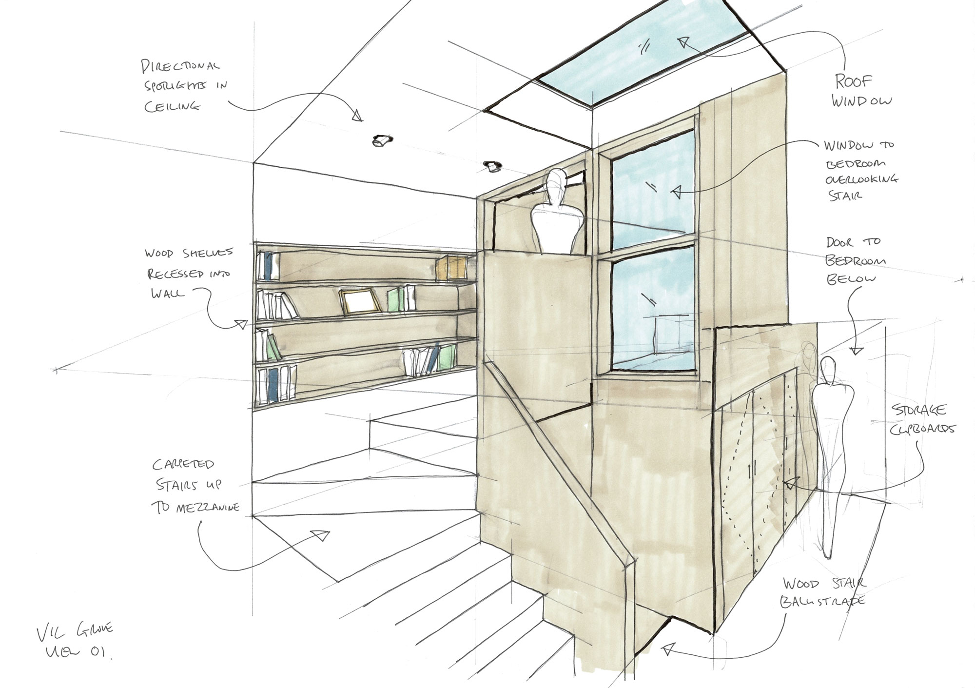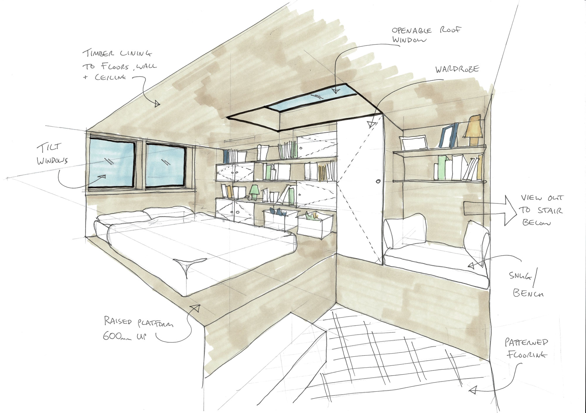 턱이져서 높아진 공간에 침대를 두었으며 2층부터 2.5층으로 올라가는 부분과 새로생긴